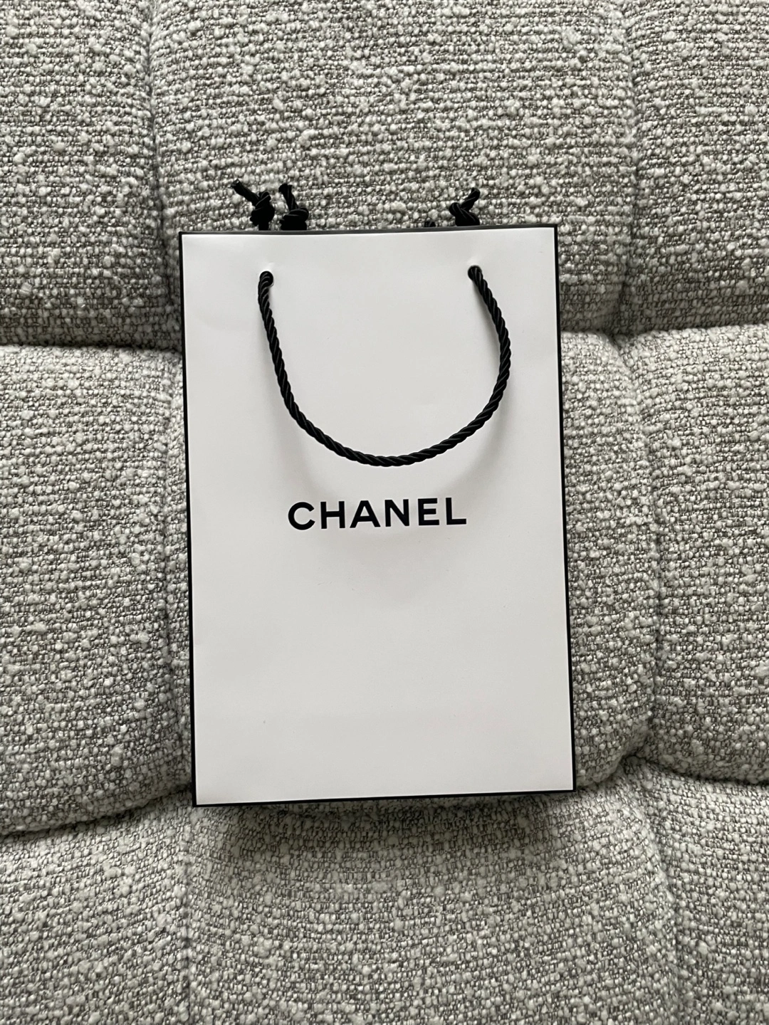 White paper shopping bag. Black rope handles. Black Chanel logo. Gently used.