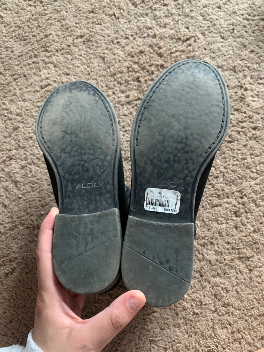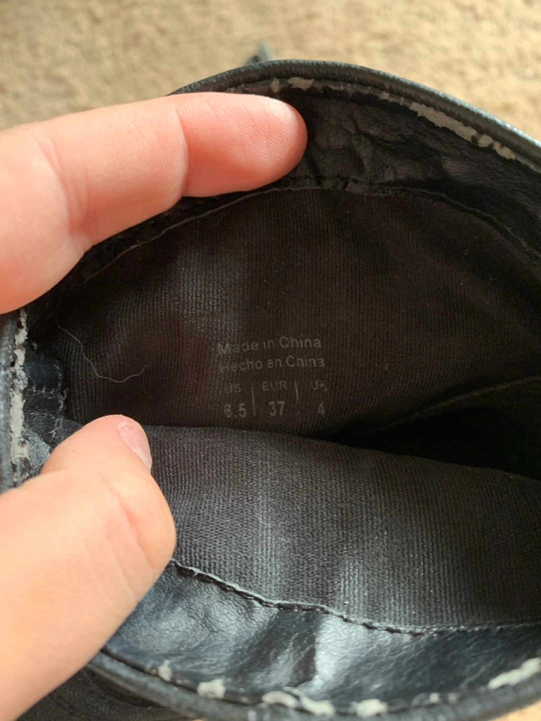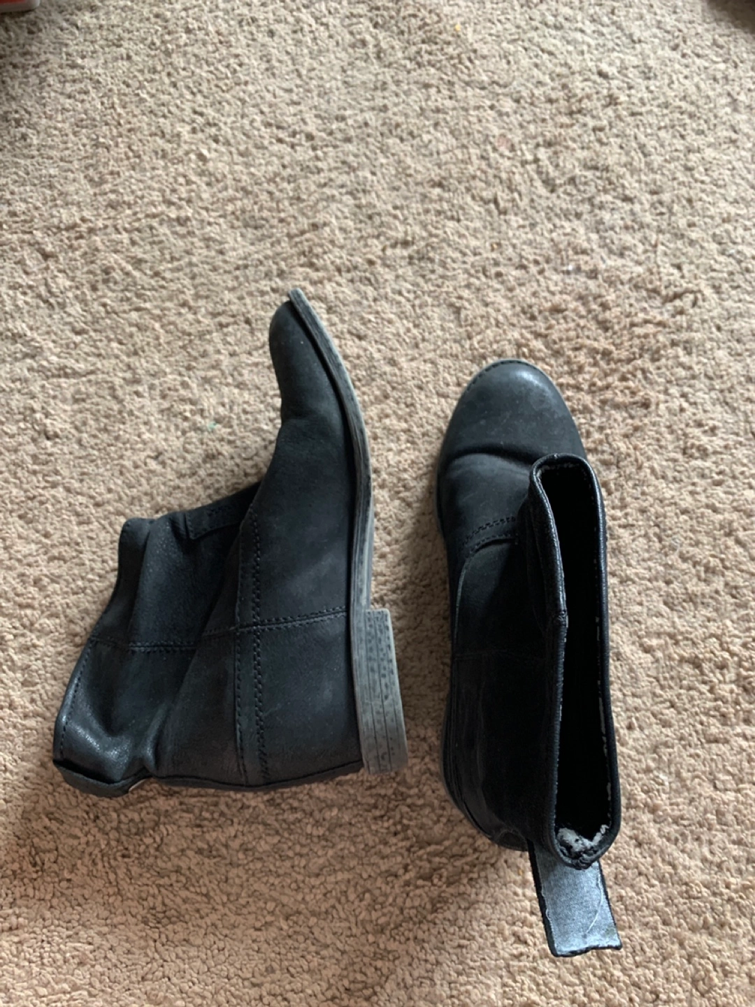 Pair of women's black suede ankle boots. Wedge heel. Size US 6.5, EUR 37. Made in China. Some wear.