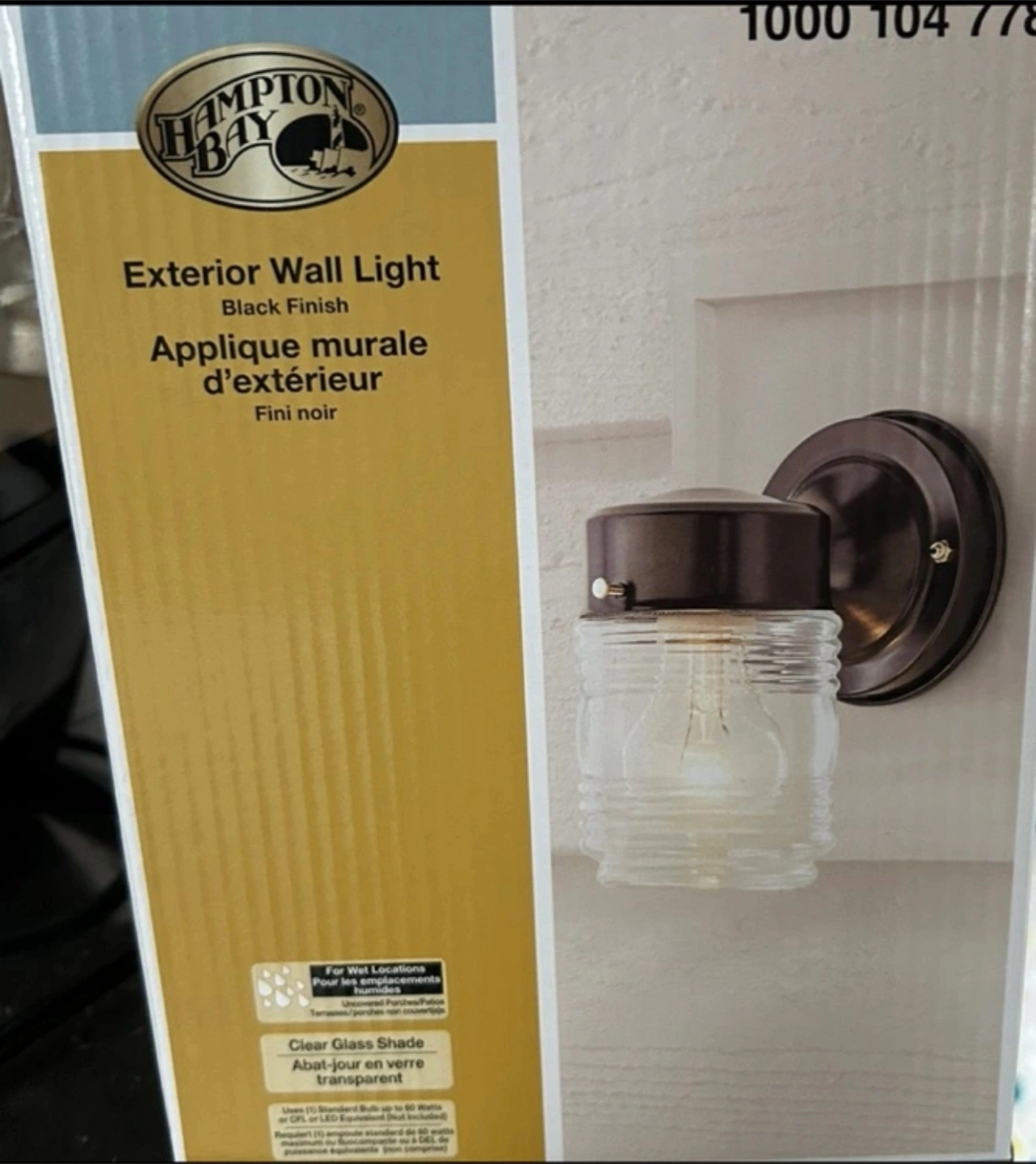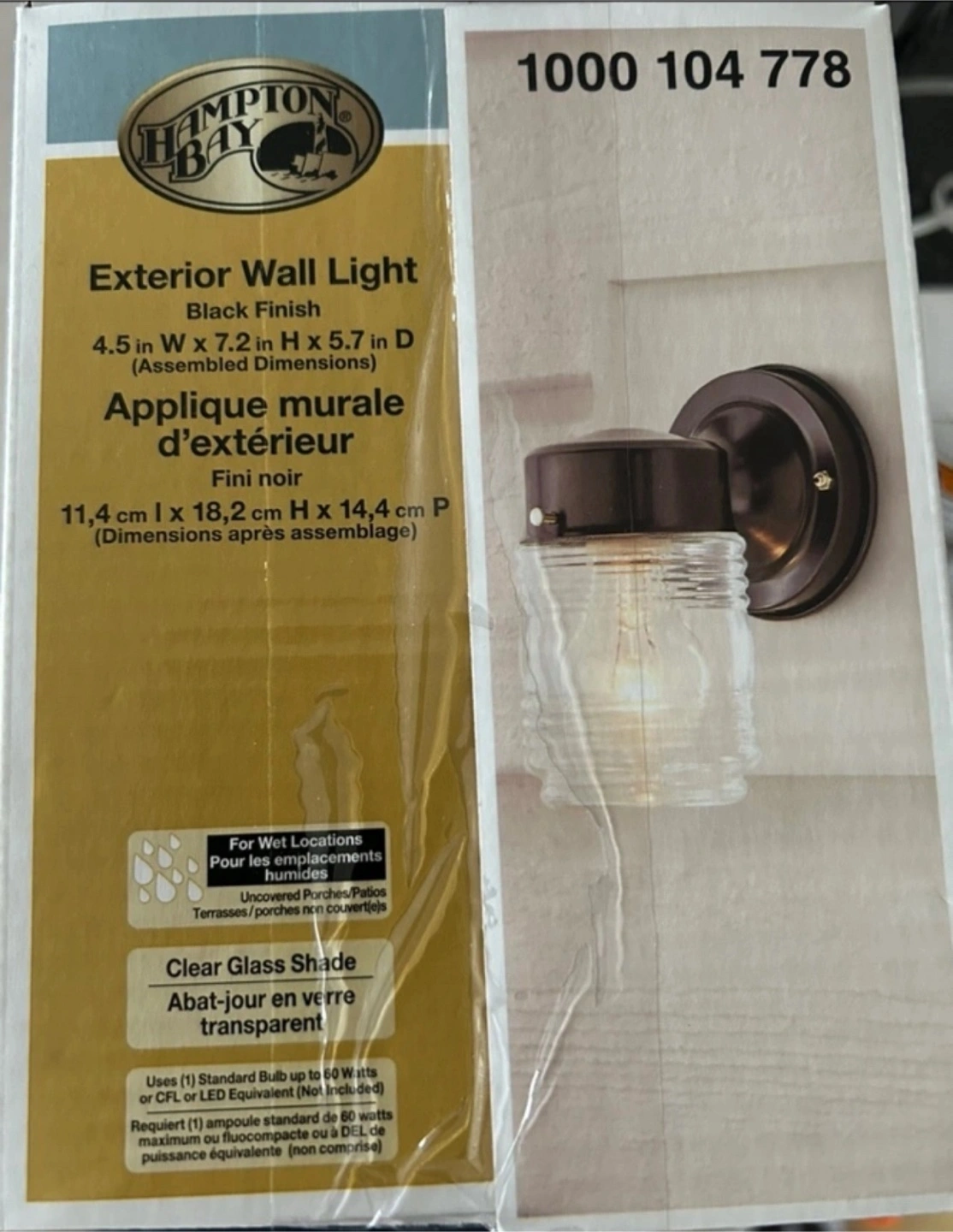 70Hampton Bay 1-Light 7-inch Black Outdoor Wall Lantern in Metal Finish with Clear Glass Shade. Still in box