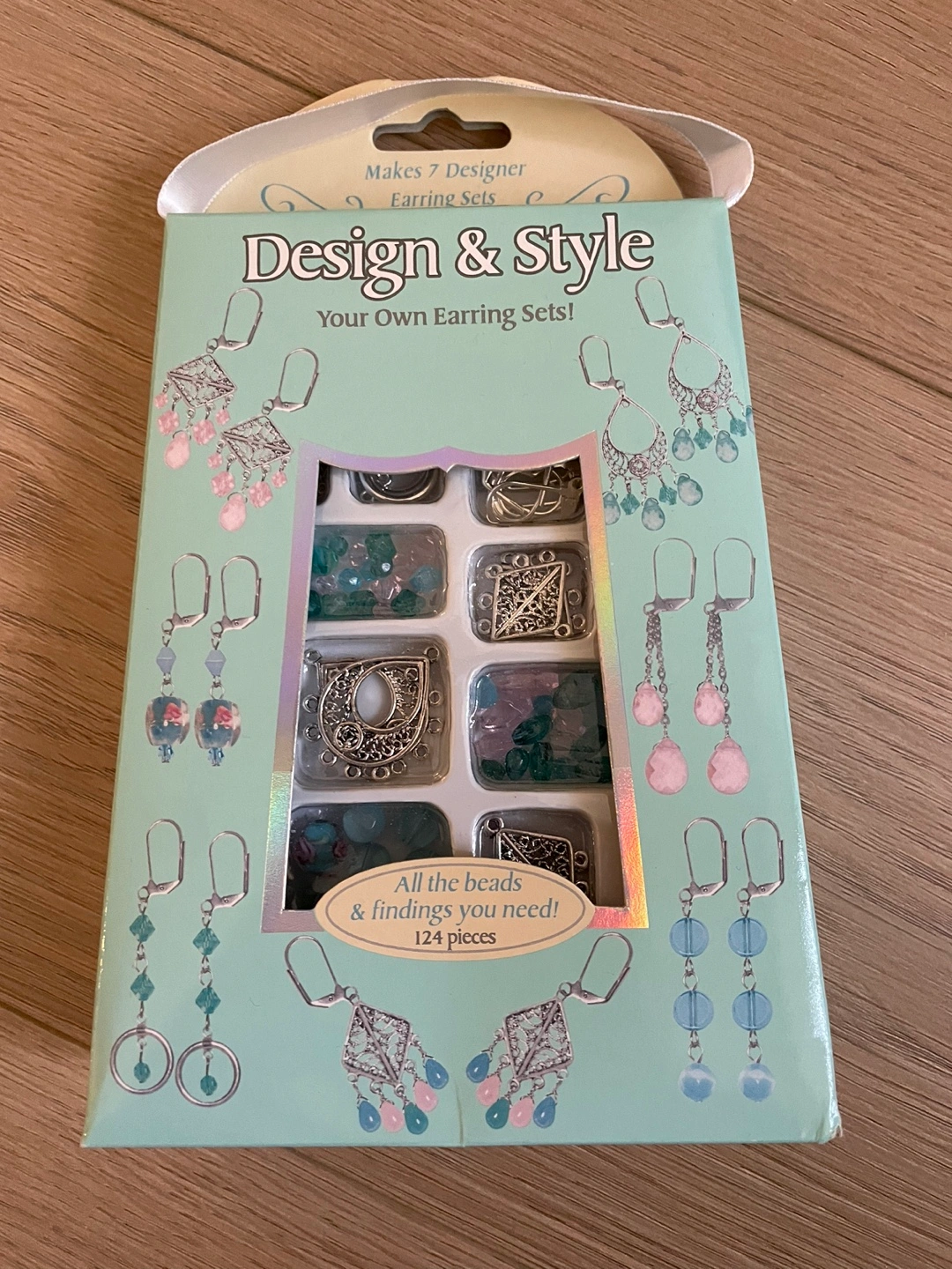 New earring making kit. Includes beads, findings, and earring hooks. Makes seven designer earring sets. 124 pieces total. Fun craft project.
