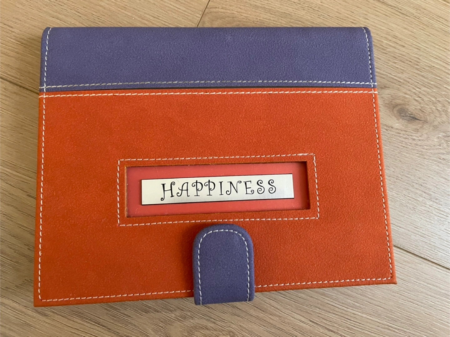 Excellent quality spiral notebook with suede-like cover and button clasp. Metal βhappinessβ plaque on top. Great for gifting or for yourself!
