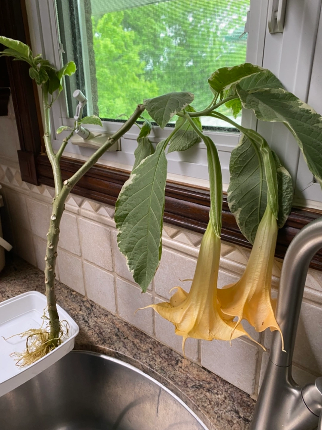Healthy Brugmansia cuttings with variegated leaves, pale yellow flowers. Rooted in water