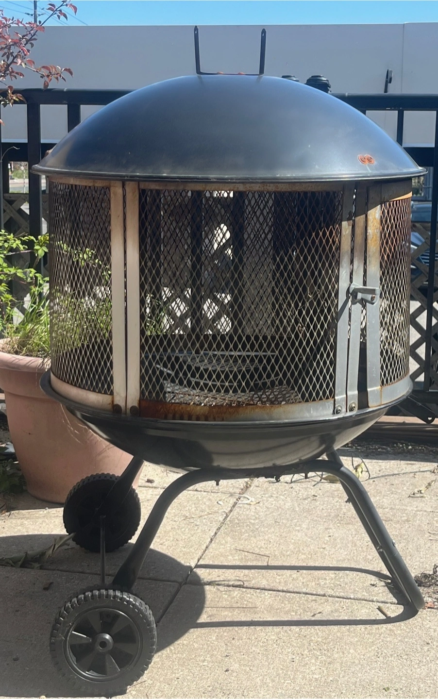 Portable fire pit, metal mesh enclosure, dome shaped lid, black finish, rust on the bowl, two wheels for mobility. Great for backyard gatherings.