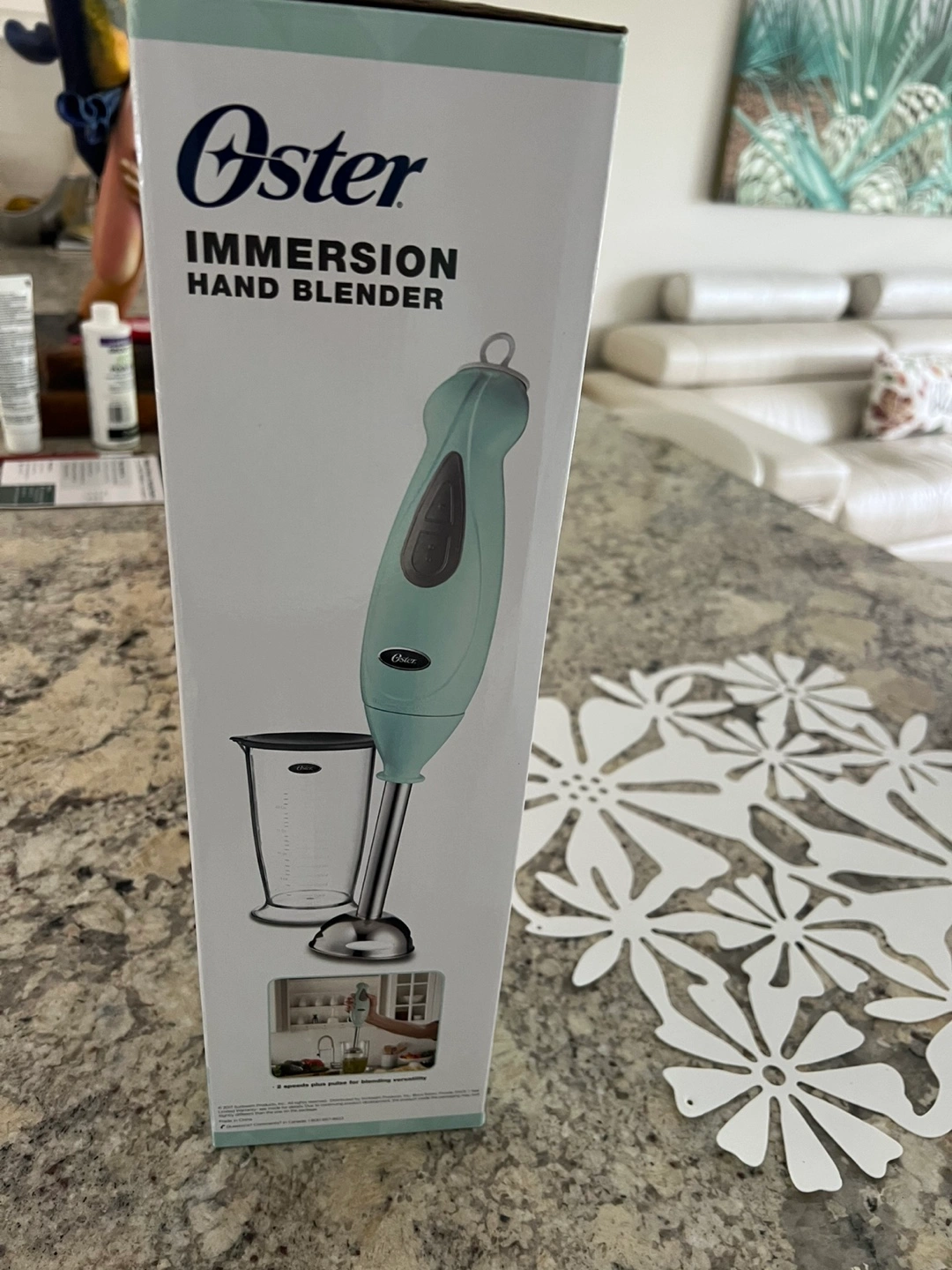 New in box, Oster immersion hand blender. Mint green colour. Includes measuring cup. Never used, makes a great gift π
