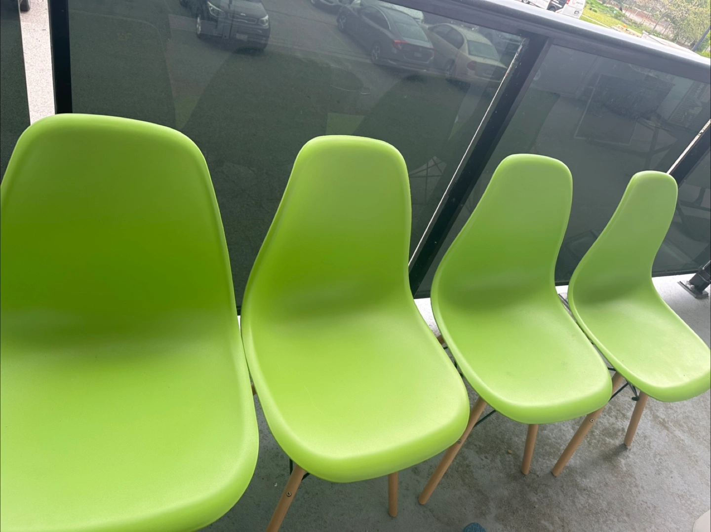 Four modern apple green Eiffel/eames chairs. Wooden legs. Good for kitchen/dining/living room or patio/balcony. Lightweight and easy to move.
