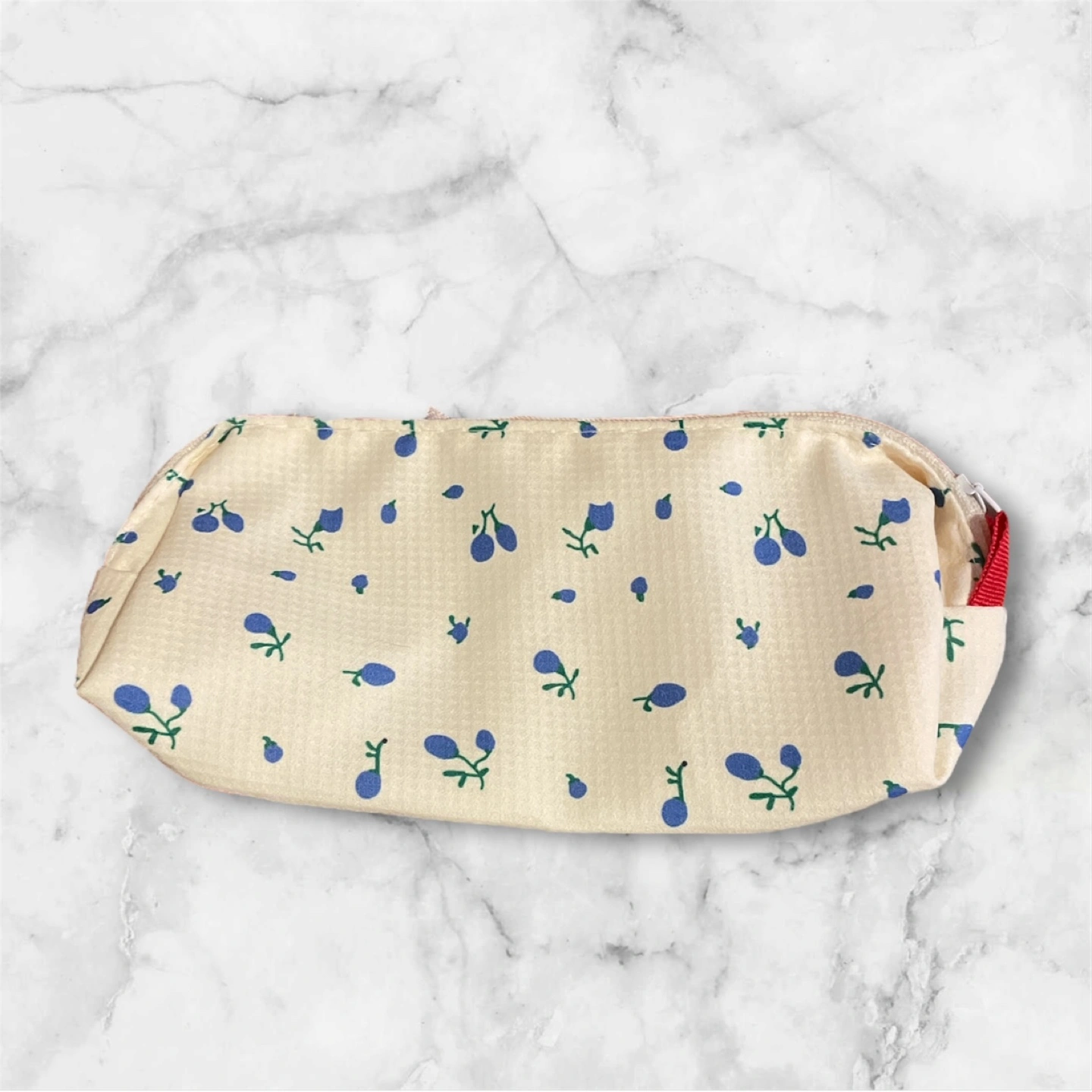 Small zippered pouch. Cream coloured fabric with blue and green floral print. Perfect for pens, pencils, or makeup.