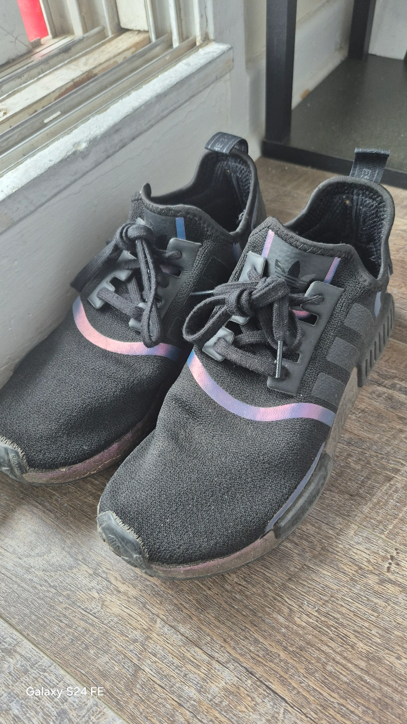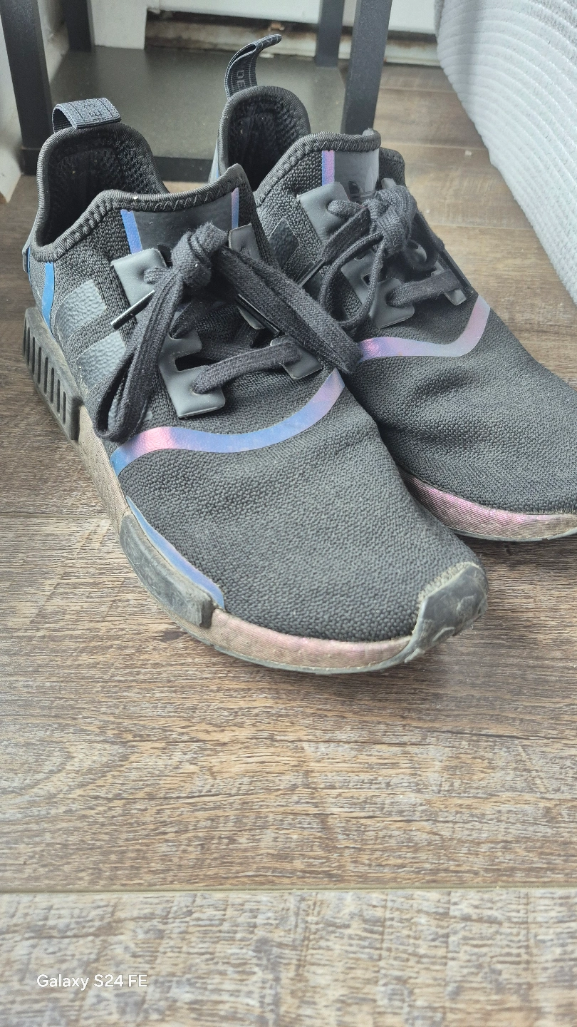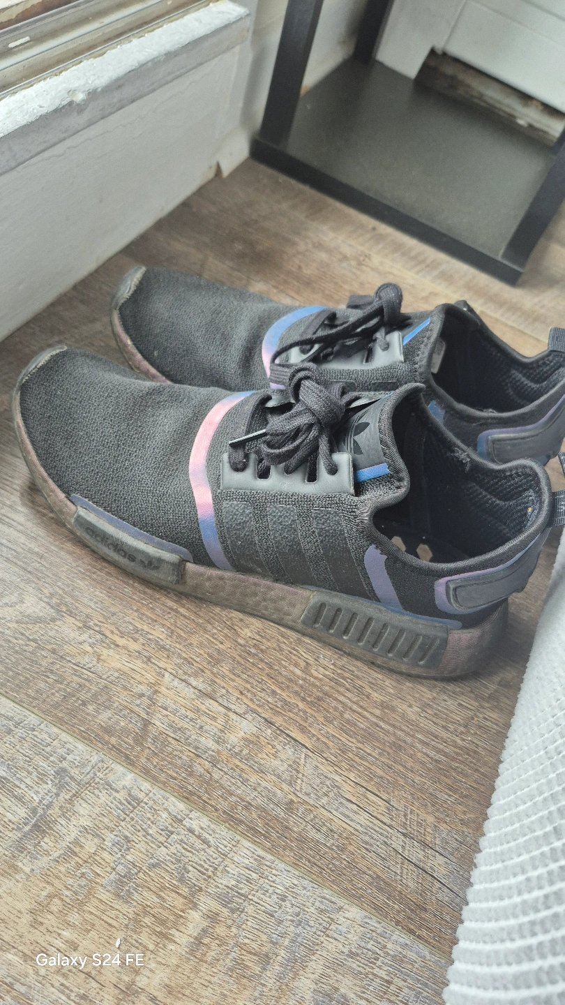 Pre-owned Adidas NMD R1 running shoes. Black with iridescent accents, galaxy effect. Minor wear and tear. Good for everyday use. Can deliver for additional 5 CAD within London.