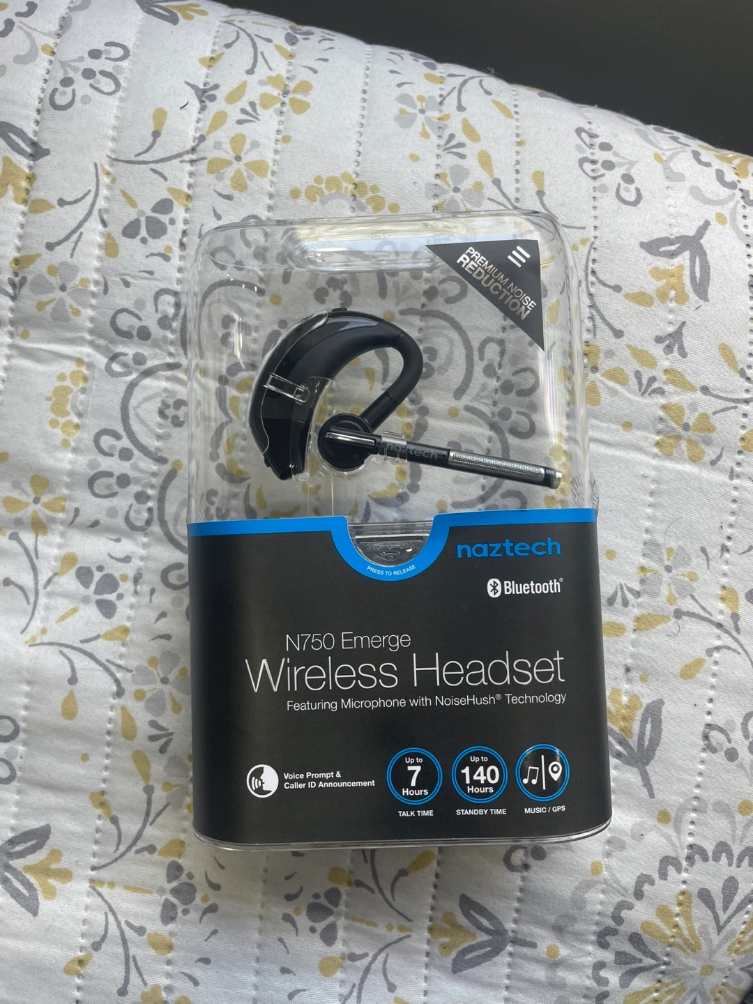 Bluetooth headset. Features noise reduction and microphone. Up to 7 hours talk time, 140 hours standby. Voice prompts and caller ID.