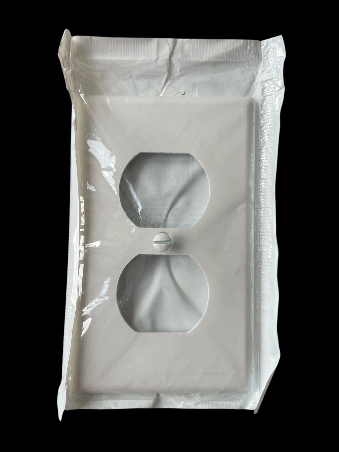 Unused single electrical outlet wall plate. Off-white colour. Packaged in plastic.