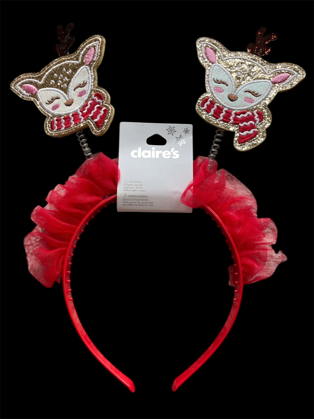 Red headband with sparkly reindeer details. Features red tulle accents. Perfect for the holidays.