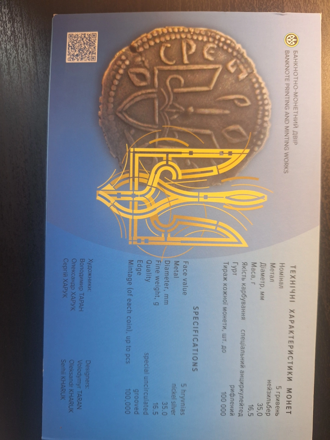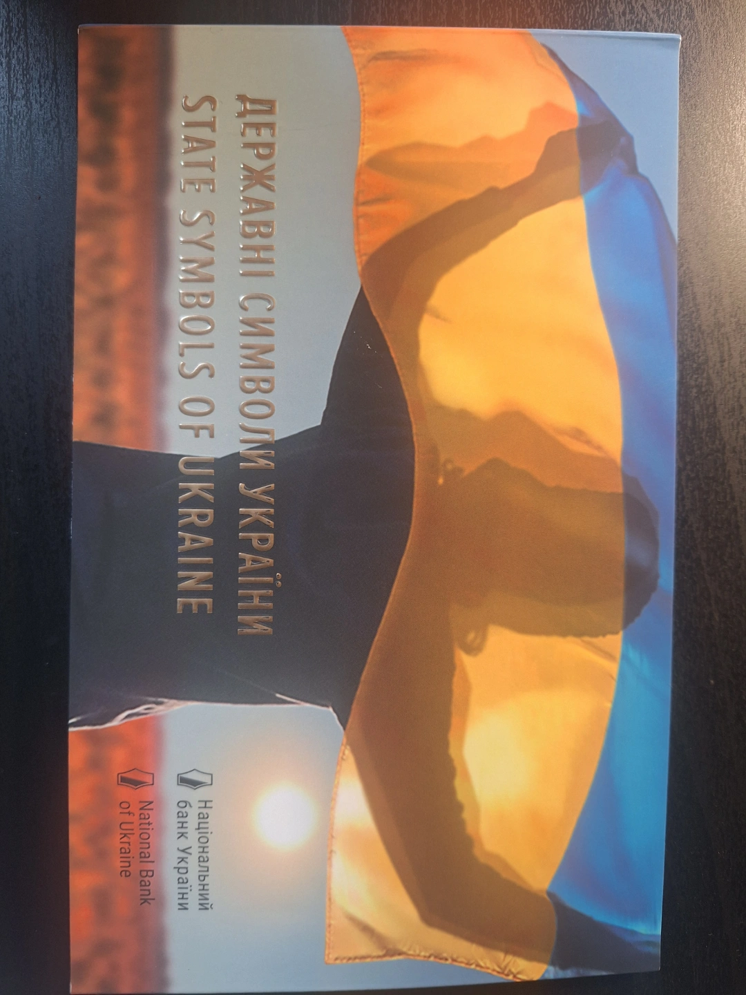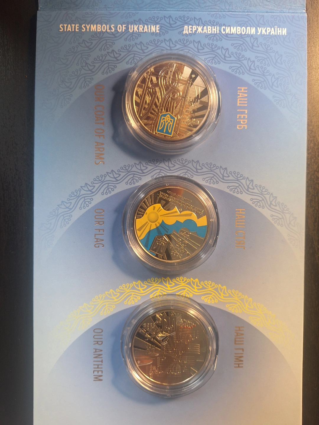 Set of three commemorative coins. Features the Coat of Arms, Flag, and Anthem. Comes in a collectible display case. Issued by the National Bank of Ukraine.