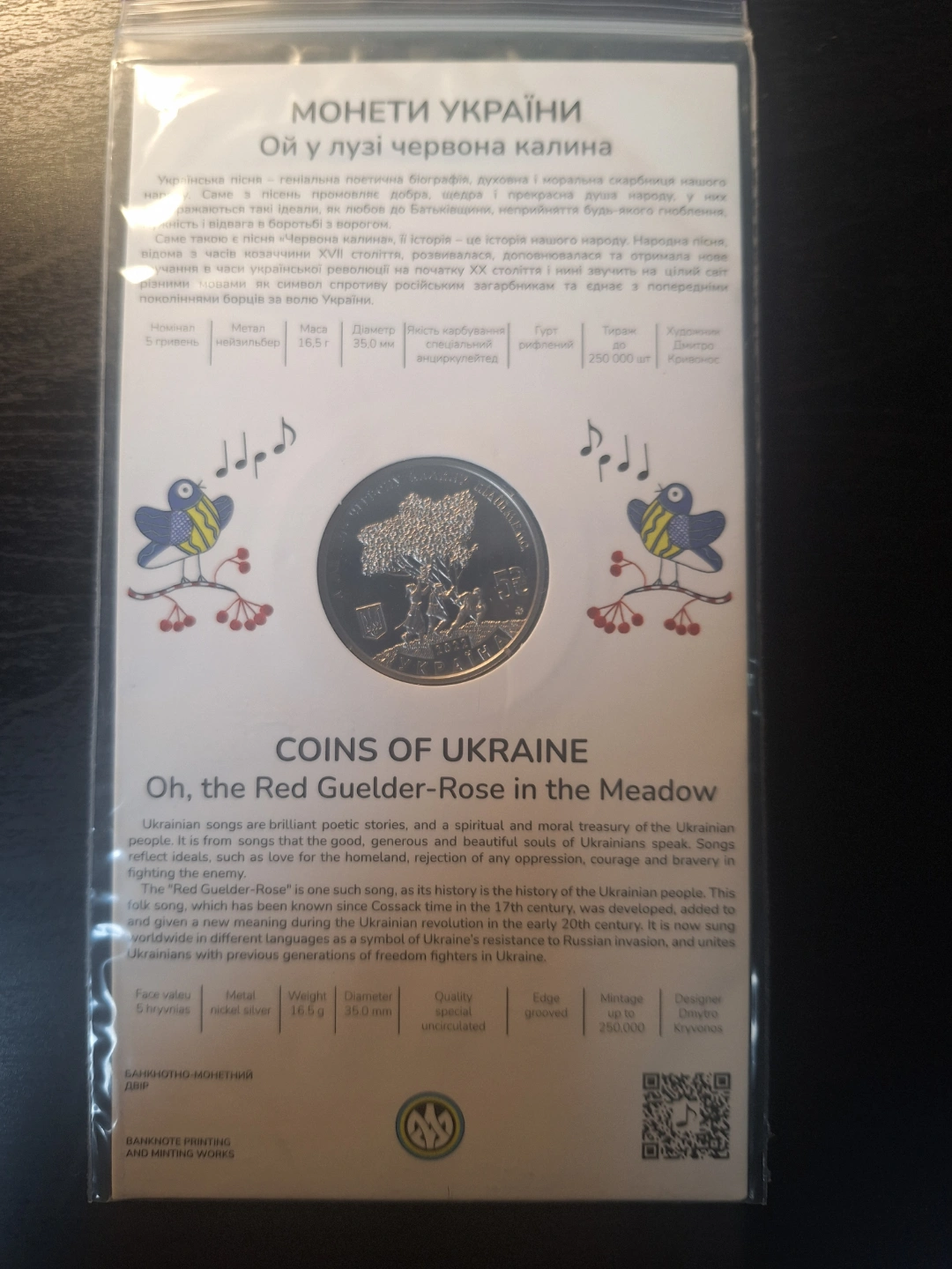 Collectible nickel silver coin in protective packaging. Features Ukrainian design and text. Includes information card with details in Ukrainian and English.
