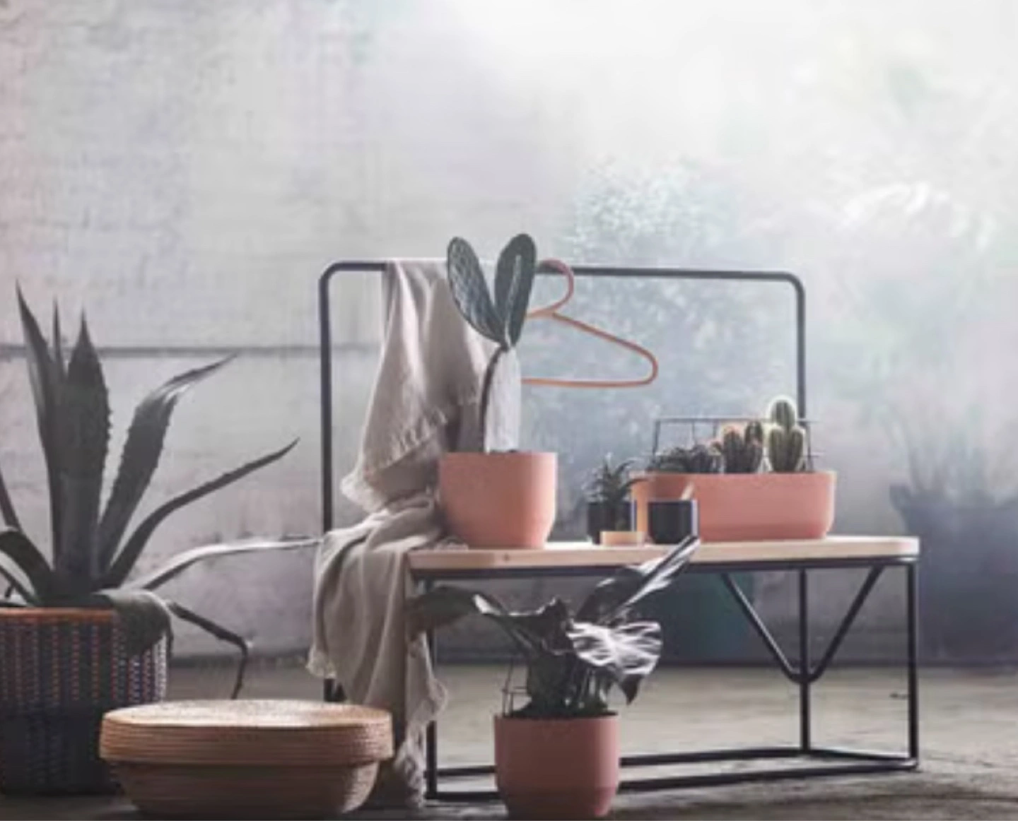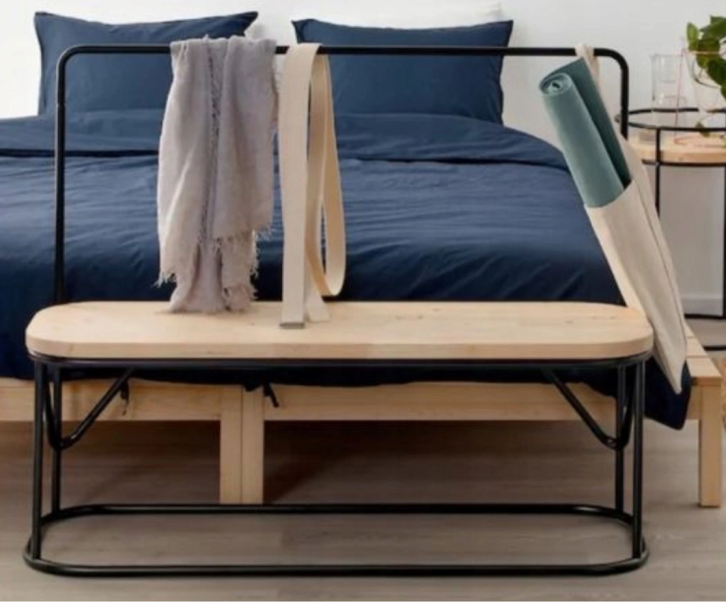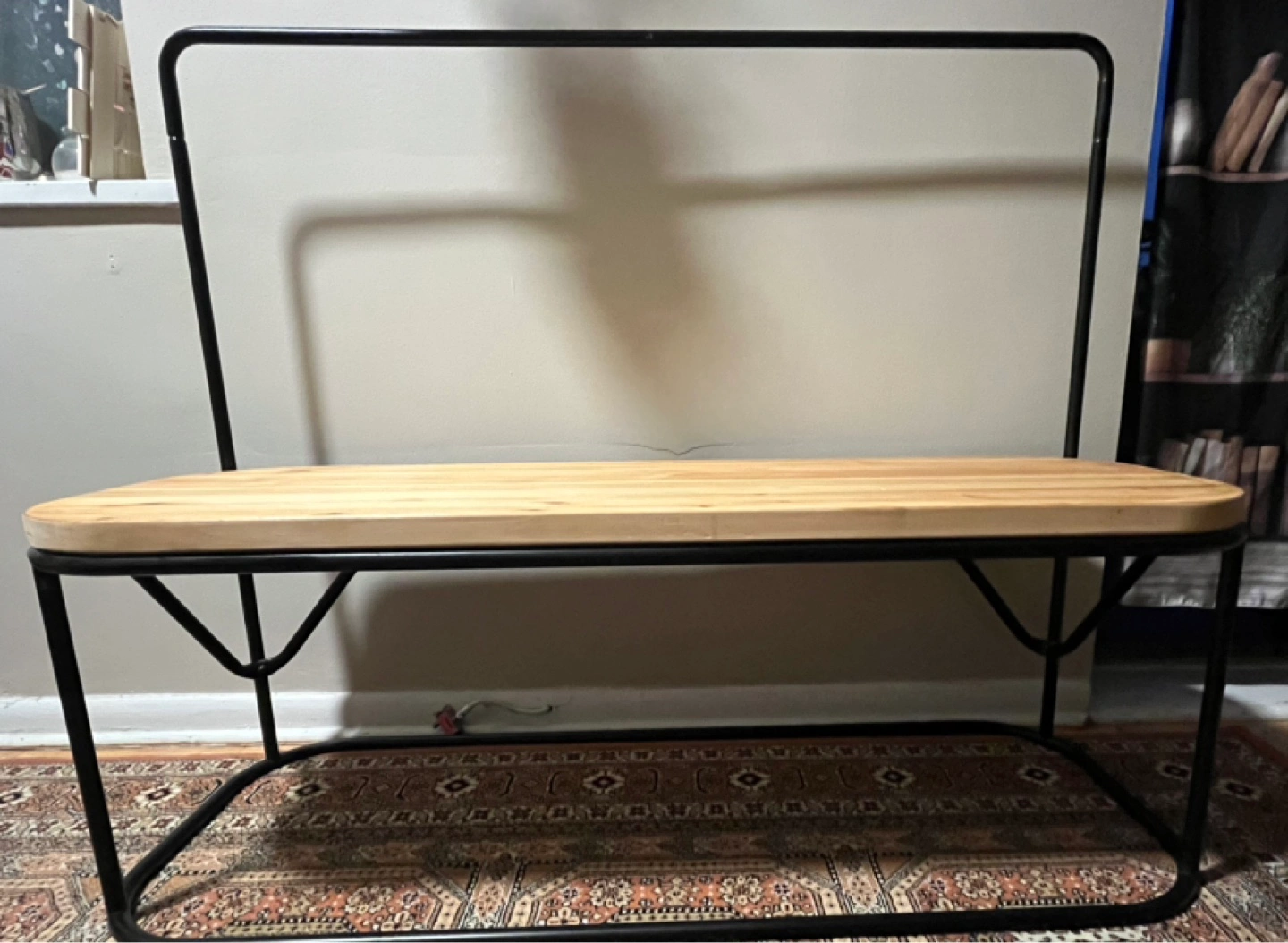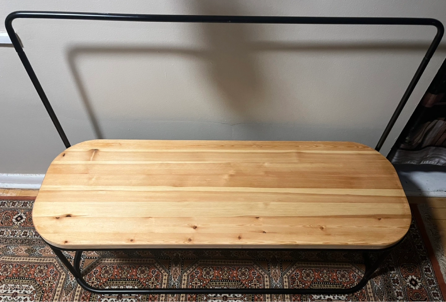 Stylish bench with a light wood top and black metal frame. Features a built-in hanging rack perfect for clothes or other items. Minimalist design, great for entryway or bedroom.