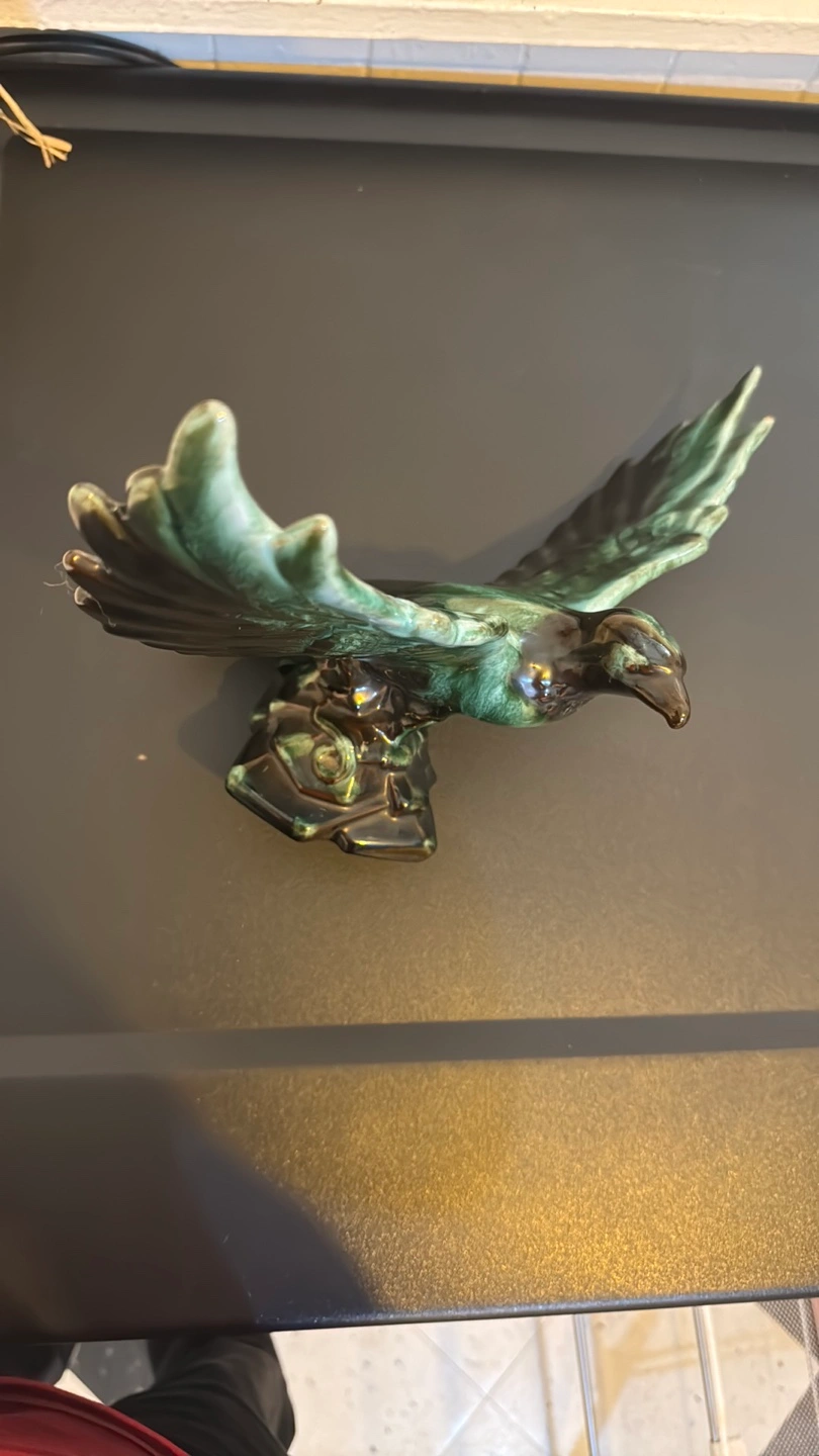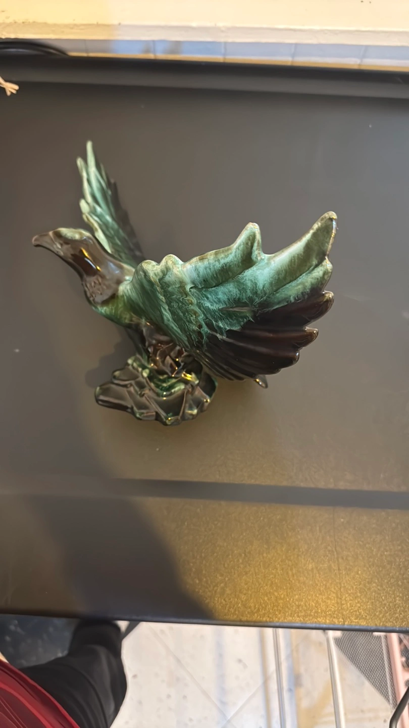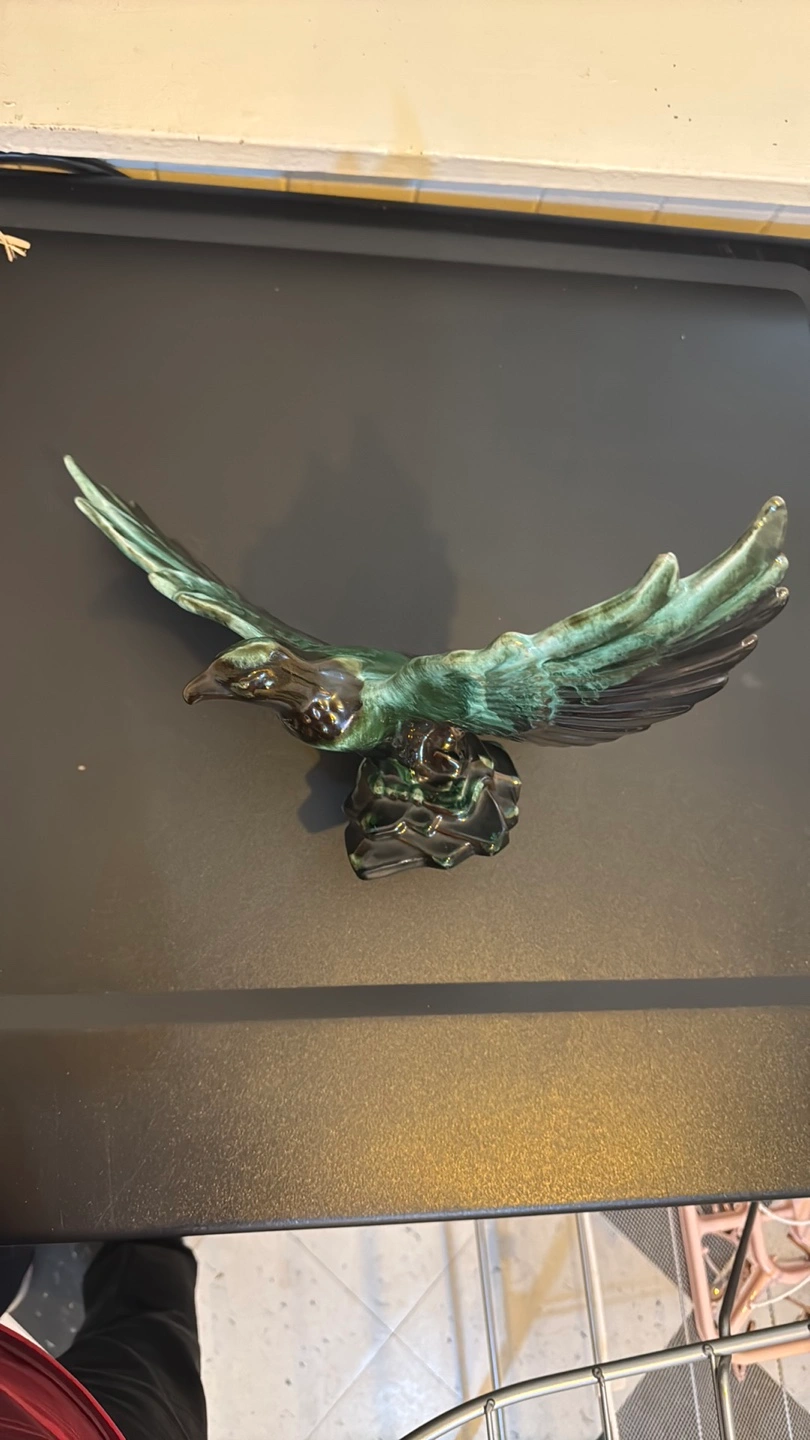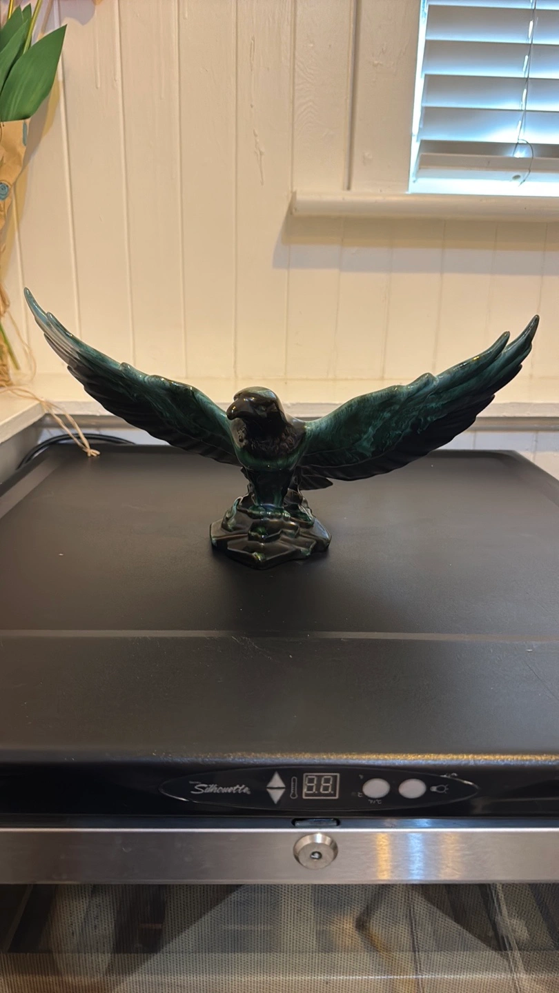 110Beautiful vintage ceramic eagle. Dark green and teal glaze. Wings outstretched. Perched on a rocky base. Collectible item.