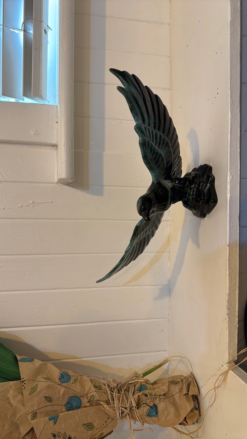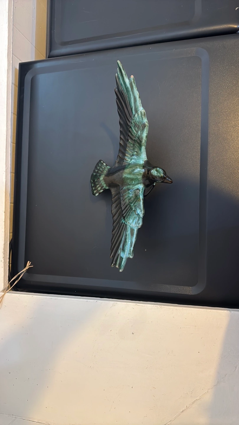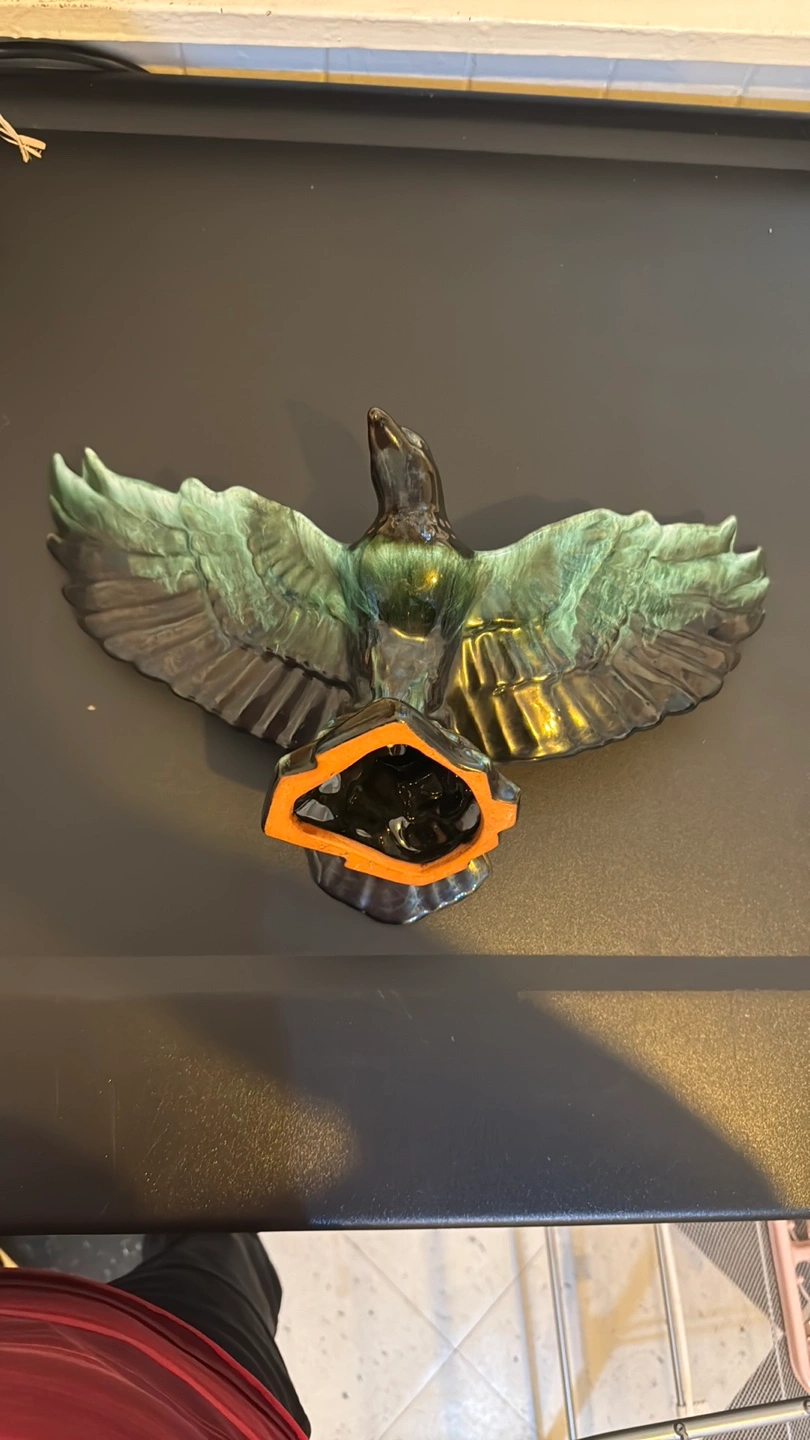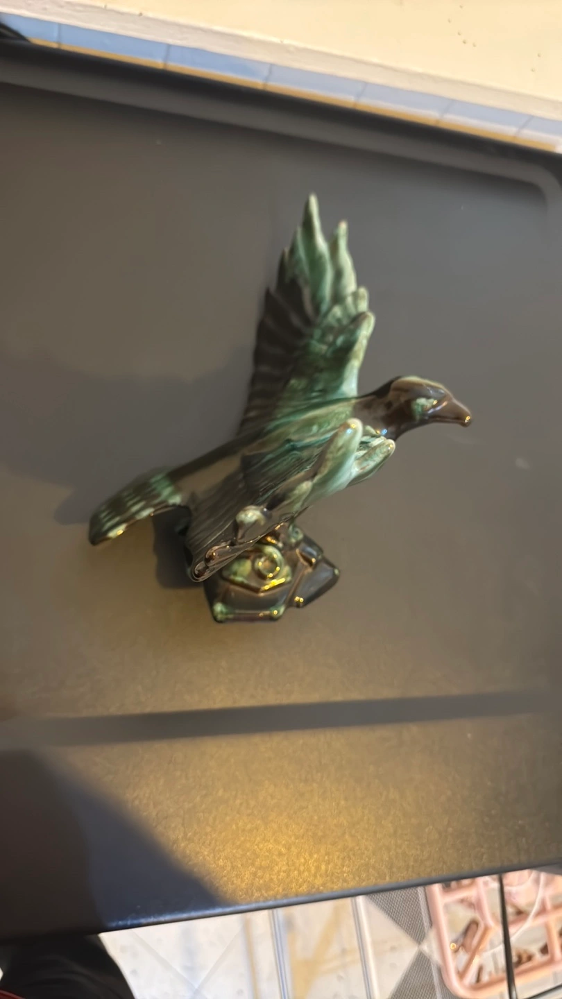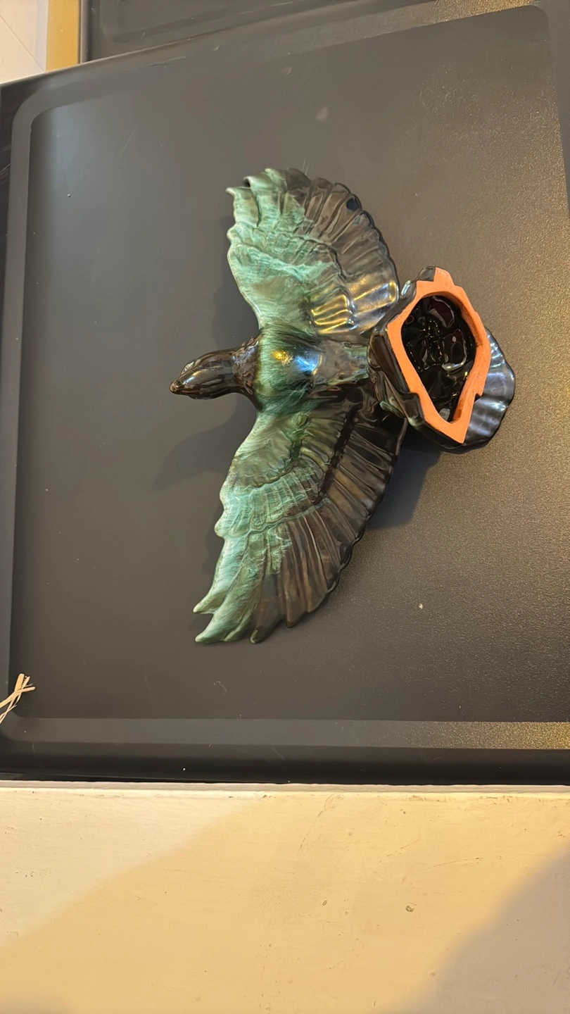 110Beautiful vintage ceramic eagle. Dark green and teal glaze. Wings outstretched. Perched on a rocky base. Collectible item.