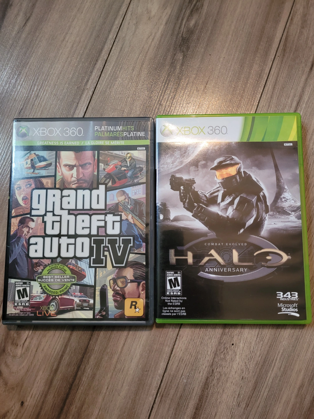 Two Xbox 360 games. Grand Theft Auto IV Platinum Hits and Halo: Combat Evolved Anniversary. Both games are complete with cases, manual and maps. 10$ each or both for 15$