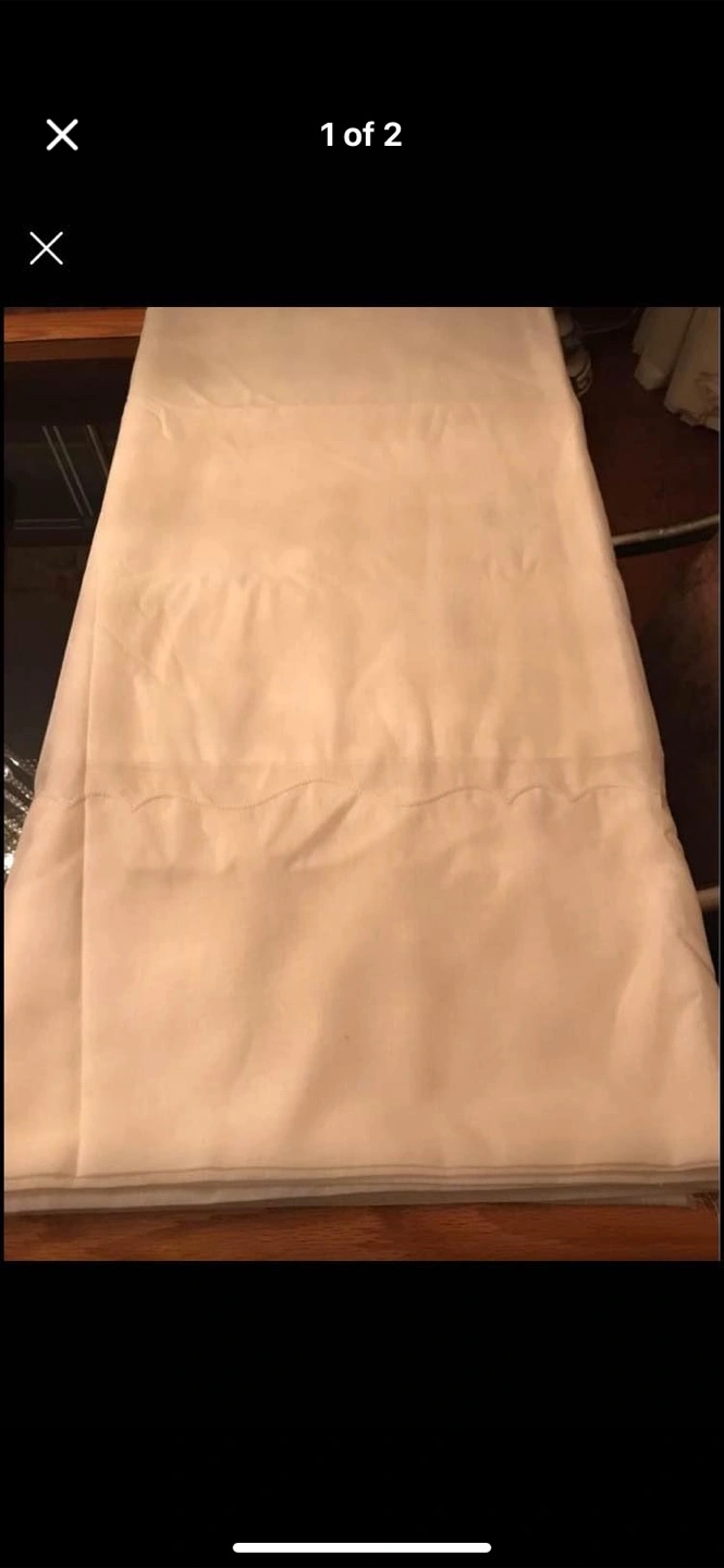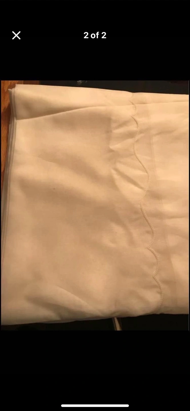 Fabric for drapes. The fabric measures 105” in length and us 8 1/2 yards wide. The bottom is finished with an embroidered scroll design cream coloured. Scalloped edge.