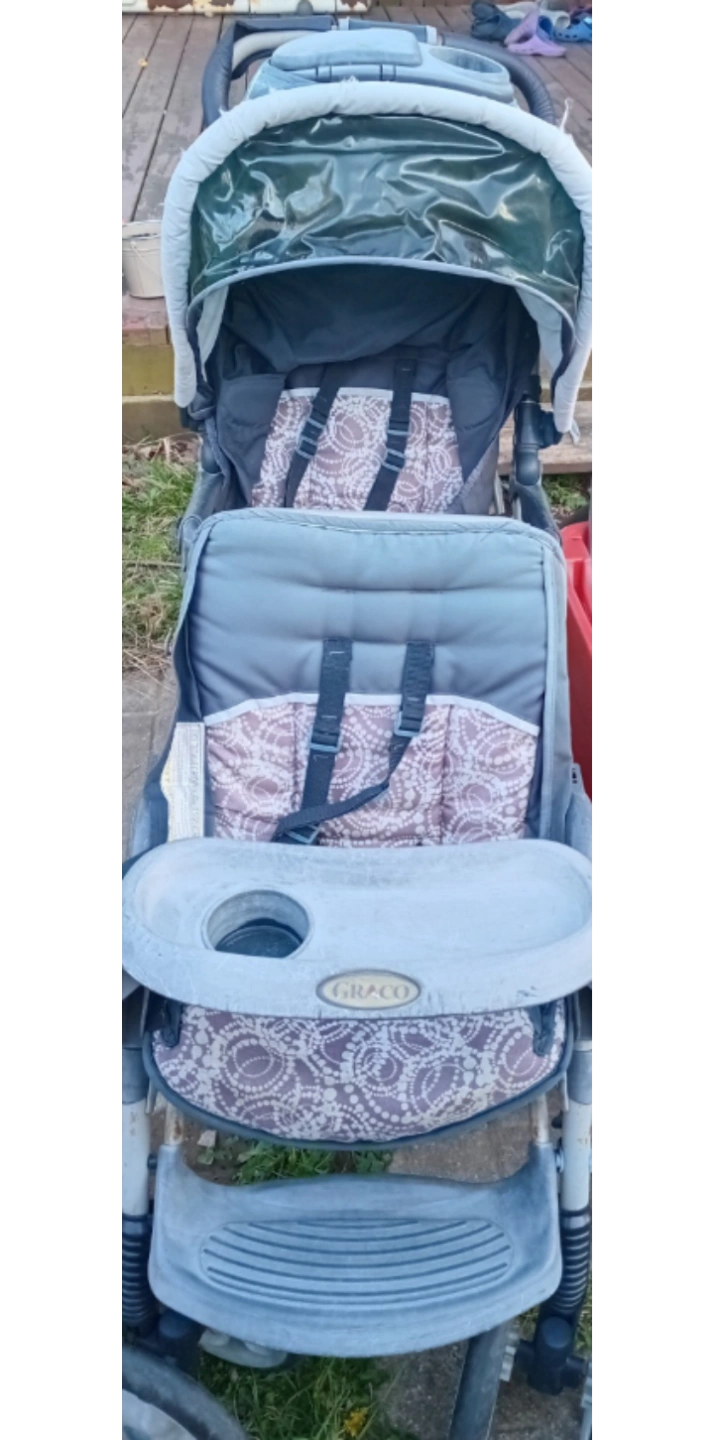 Used Graco double stroller. Grey and brown fabric. Parent tray included. Some wear and tear.but stll in good conditions. The back seat can go in sleeping position, can easily used in grocery store and bus.
