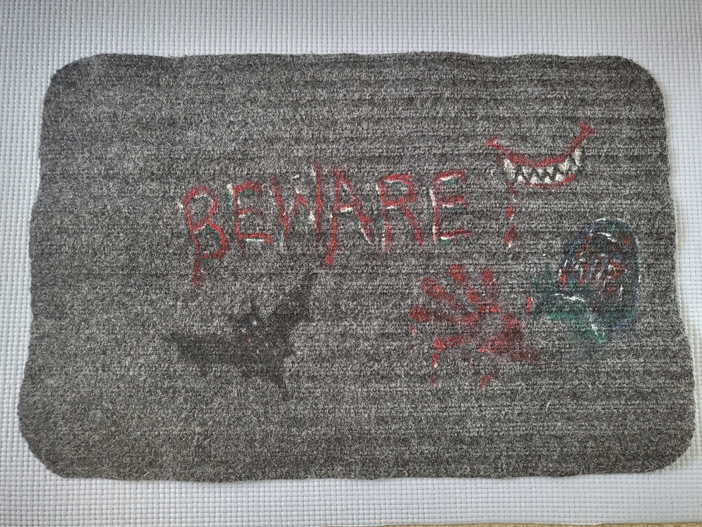Grey Halloween-themed doormat. Features the word "Beware" and spooky drawings. Machine washable.
