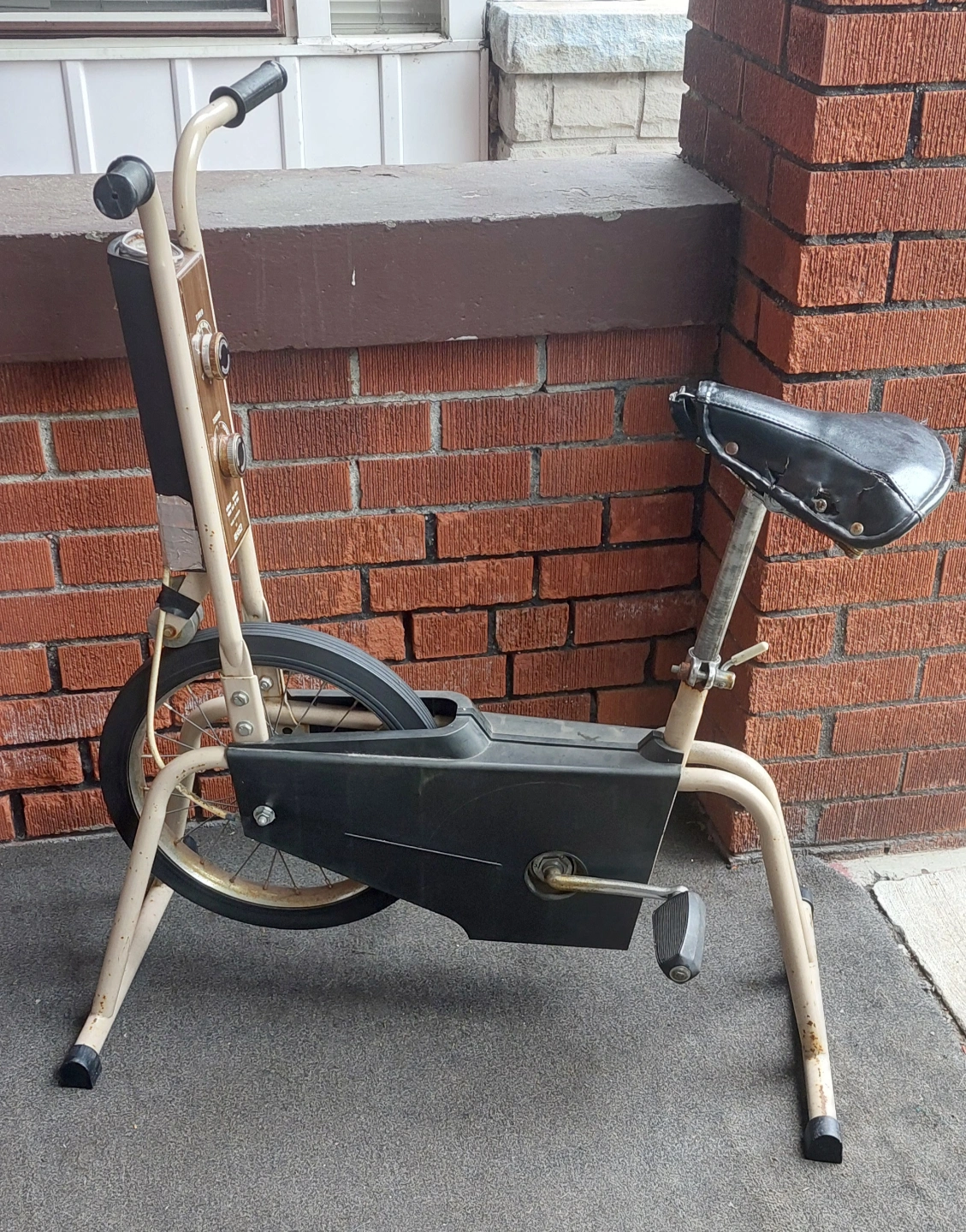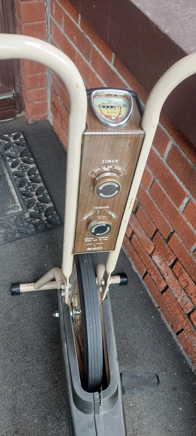 586Vintage exercise bike. Working condition. Features adjustable timer. Tension not working. Ready for a workout.