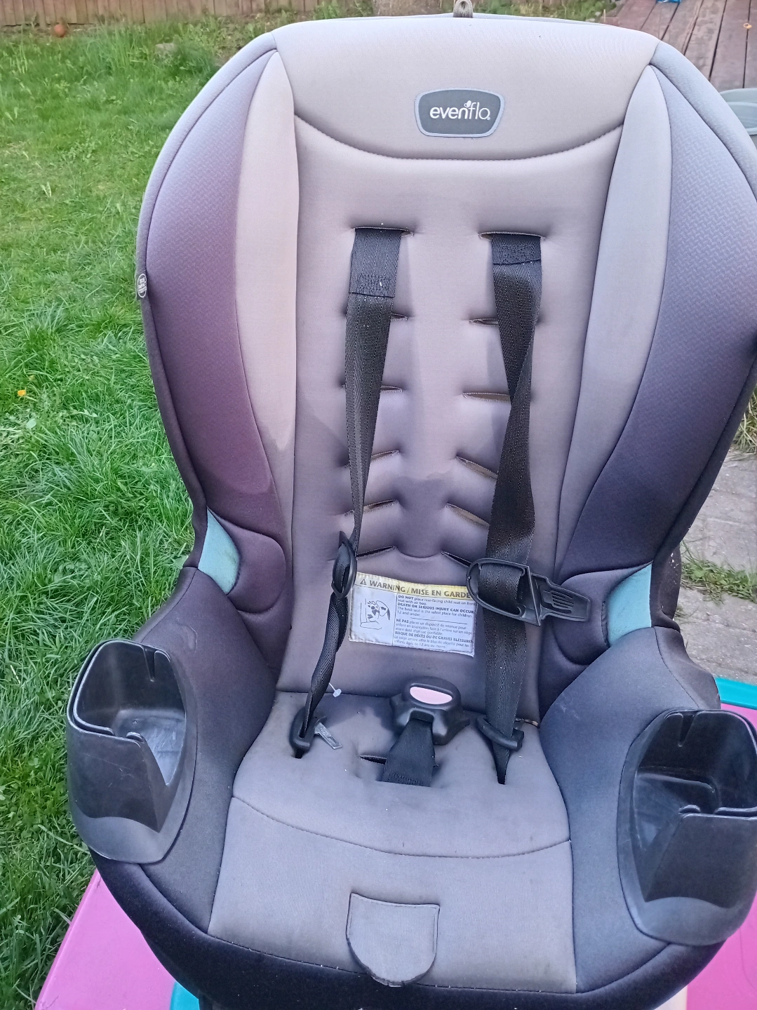 Used Evenflo car seat. Grey and black. Includes cup holders. like new ,i need to find cup holder but there is elastic bottkes can still stays there.