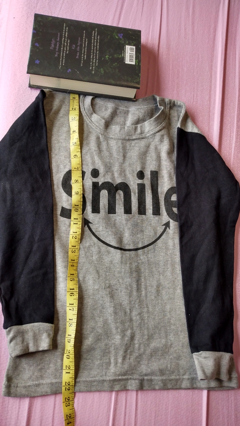 Adorable kids' clothing set. Grey long-sleeve shirt and matching joggers. Features black accents on sleeves and pant legs. 'Smile' graphic on both pieces. Good condition.