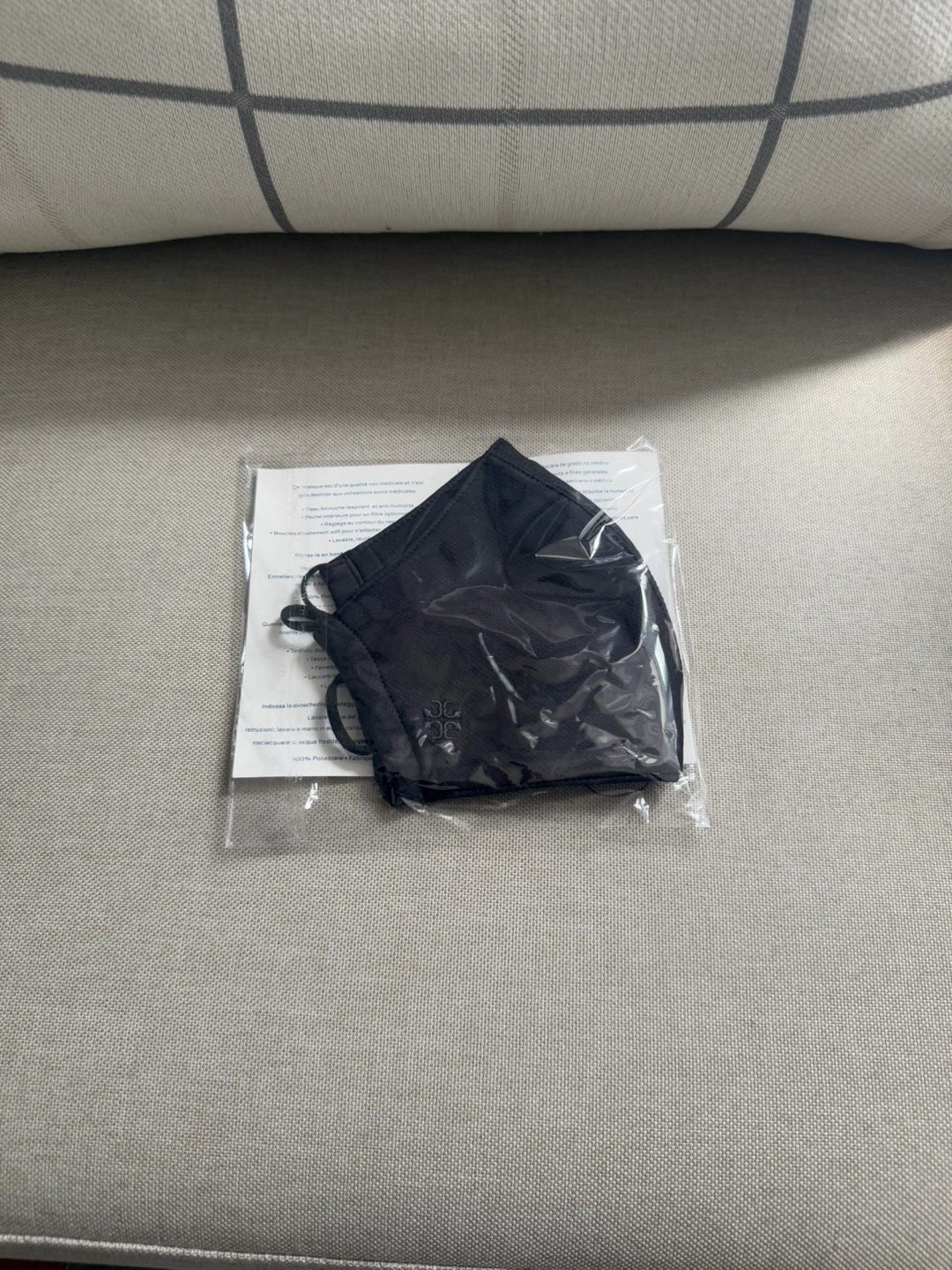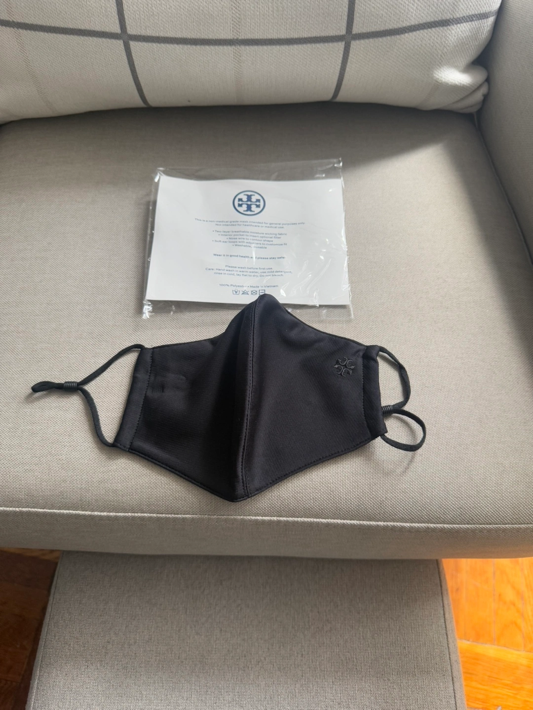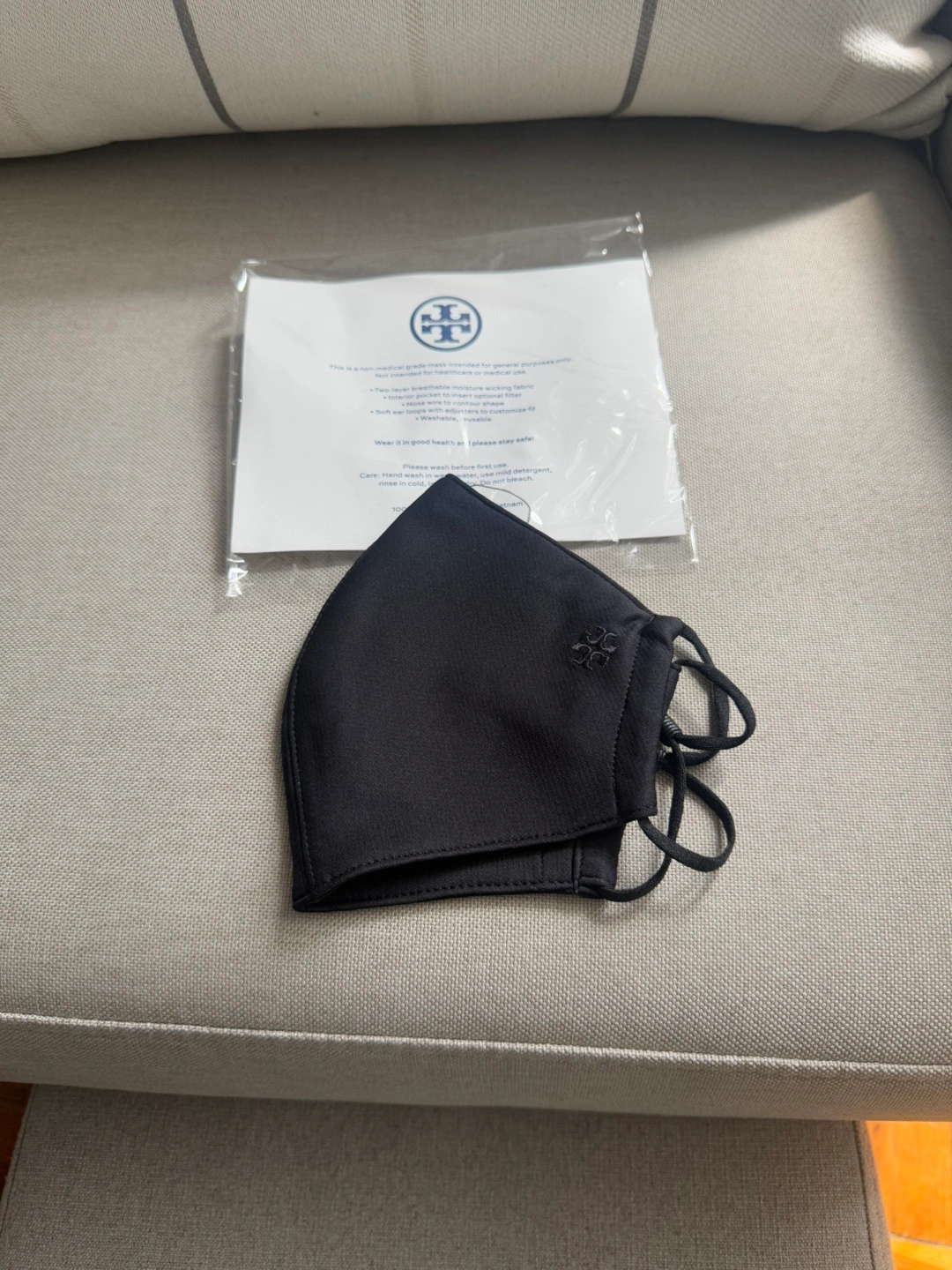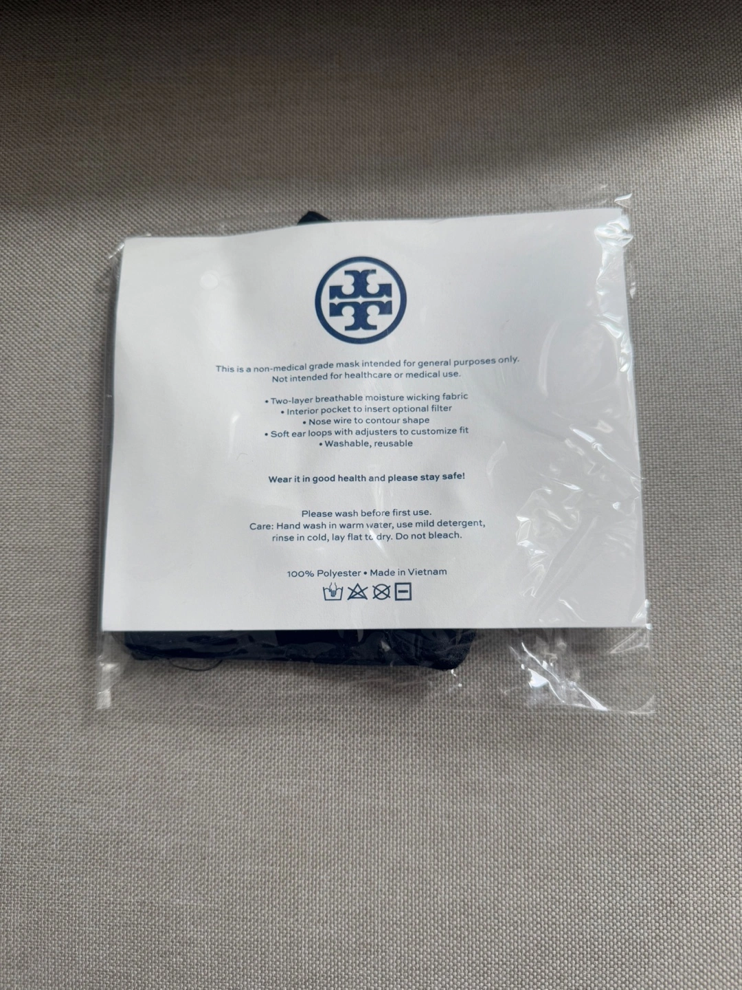 Reusable black face mask. Two-layer breathable moisture-wicking fabric. Nose wire for contour. Soft ear loops for customizable fit. New with tags.