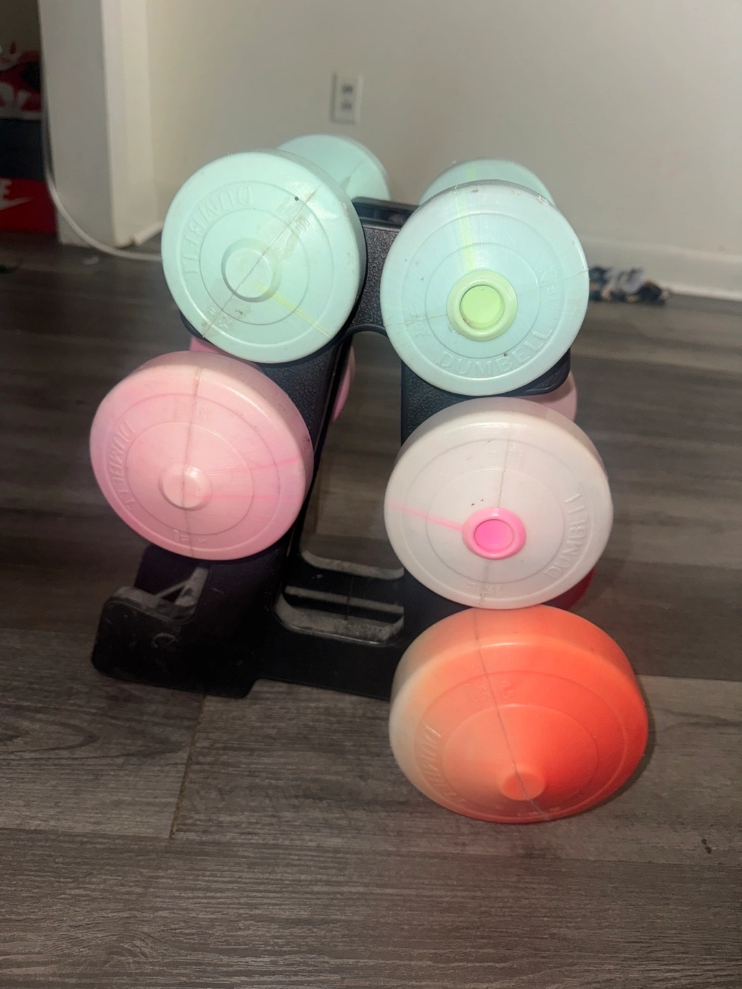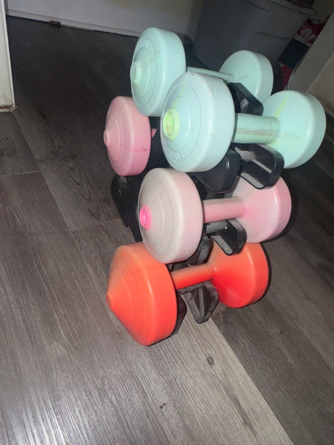 Set of pastel coloured dumbbells. Includes a rack. Great for light workouts. 4.5. 2.5. 2.3 The weight of each dumbbells