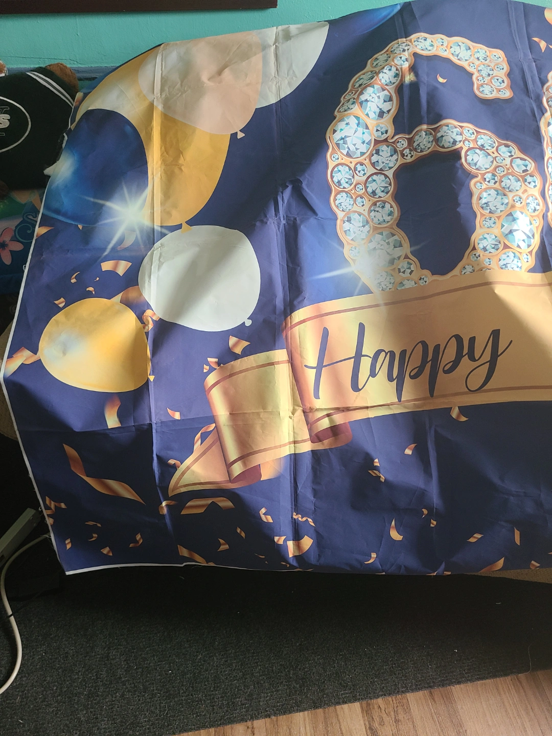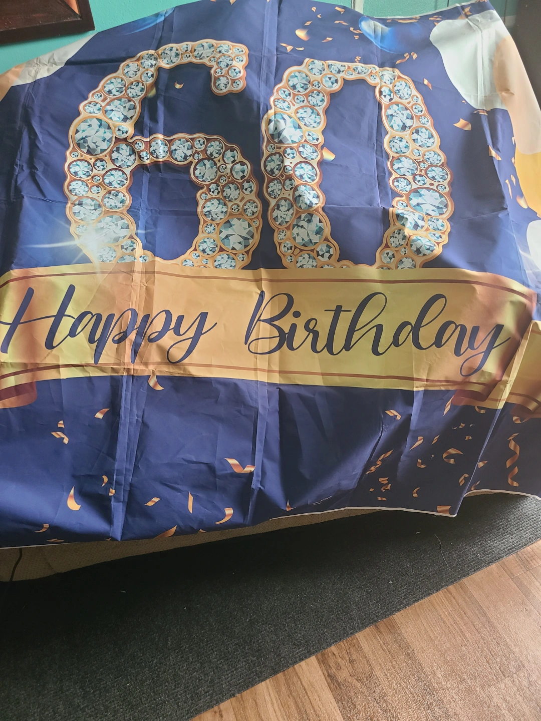 Happy 60th Birthday backdrop. Features a large number 60 adorned with diamonds, gold ribbon, and balloons. Dark blue background with gold and white accents. Perfect for a 60th birthday celebration. 58 × 81 inches