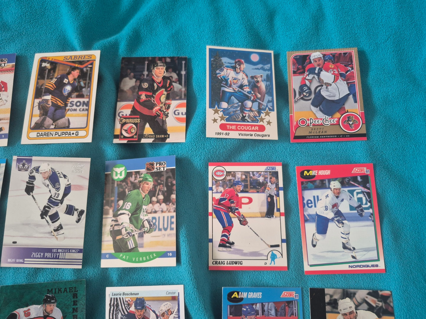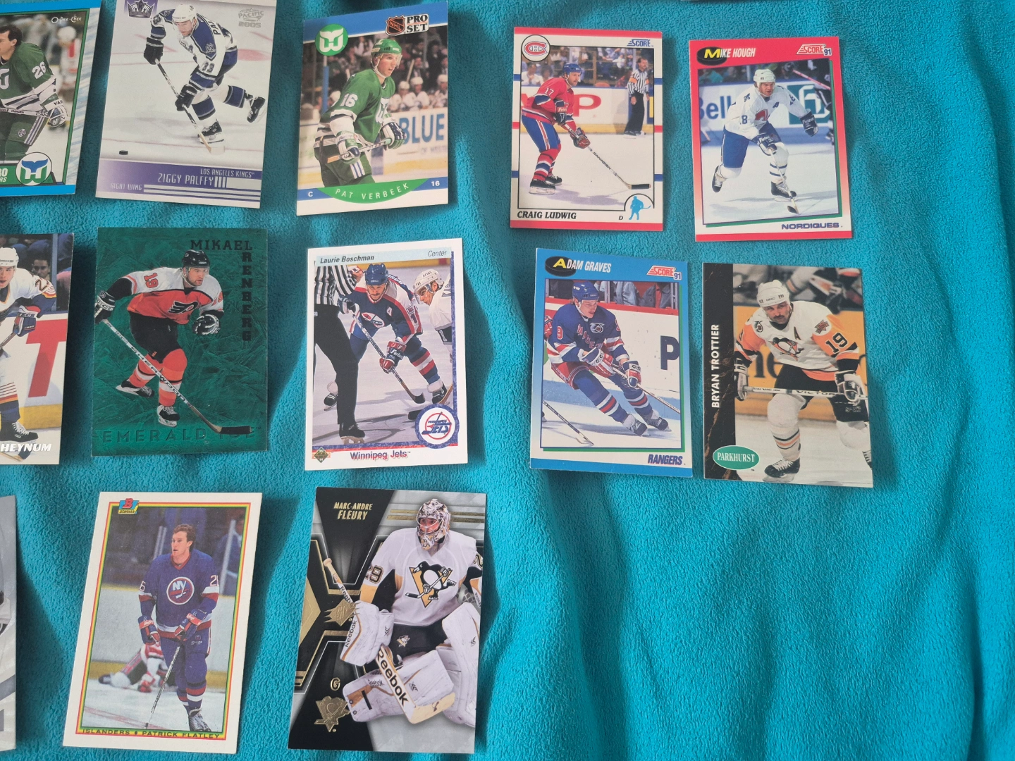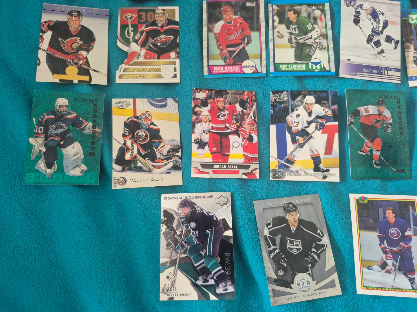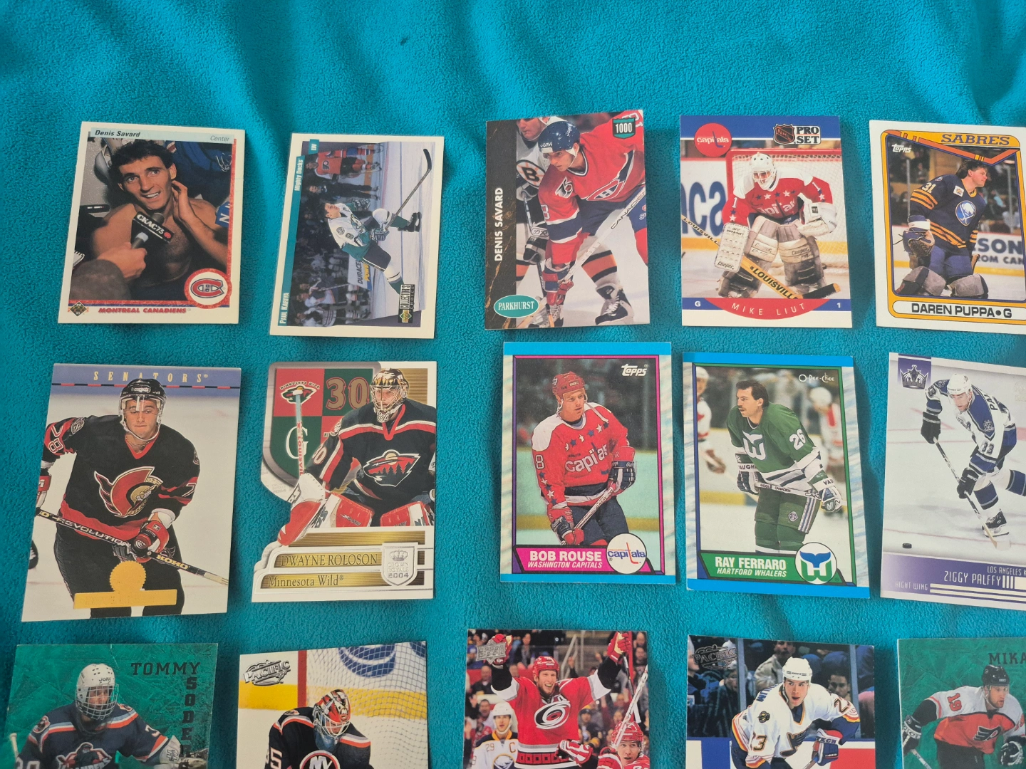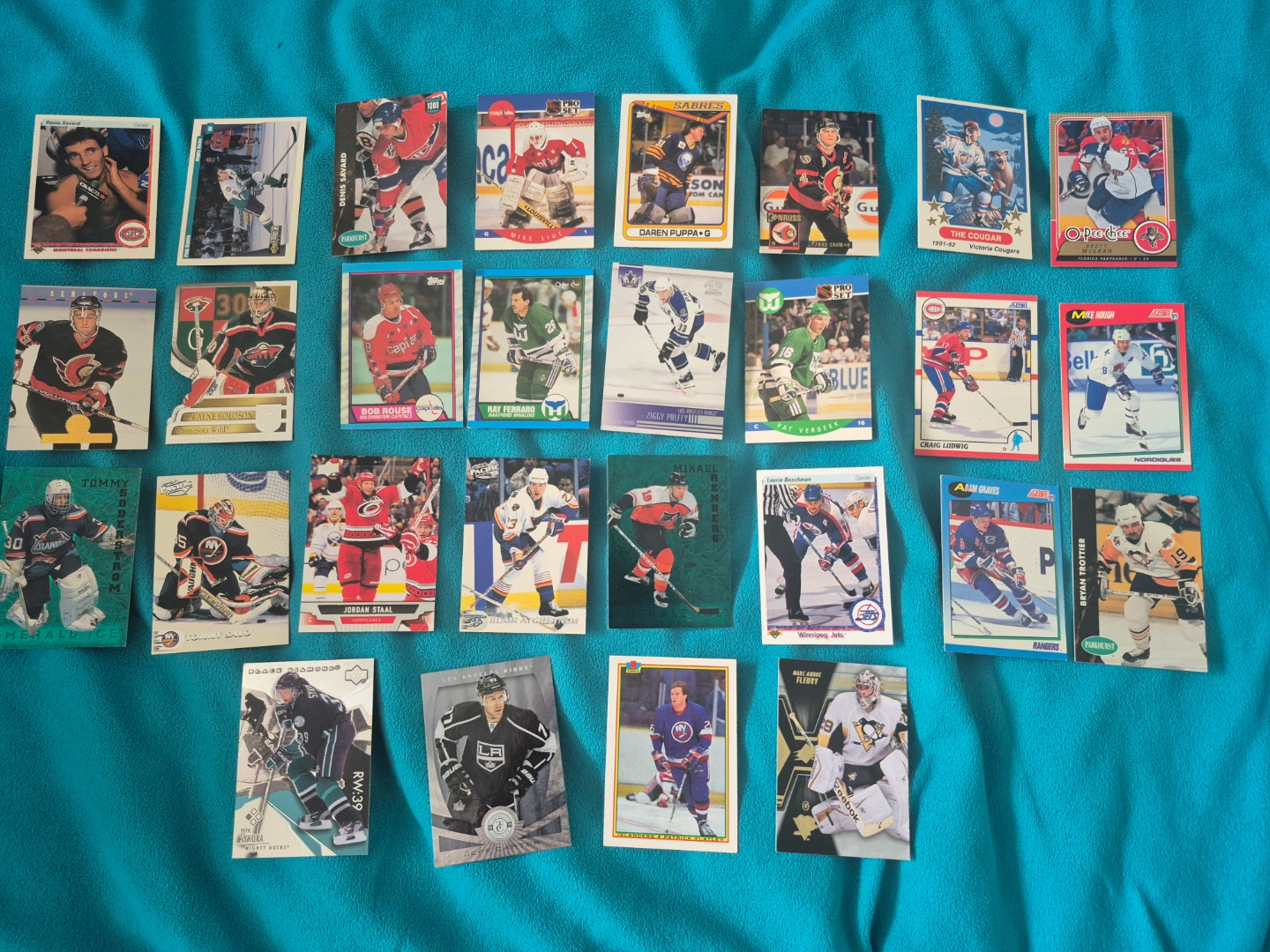 Large collection of hockey trading cards. Features various players and teams. Many different brands included. Great for collectors. Cards are available individually for 3-5 dollars.