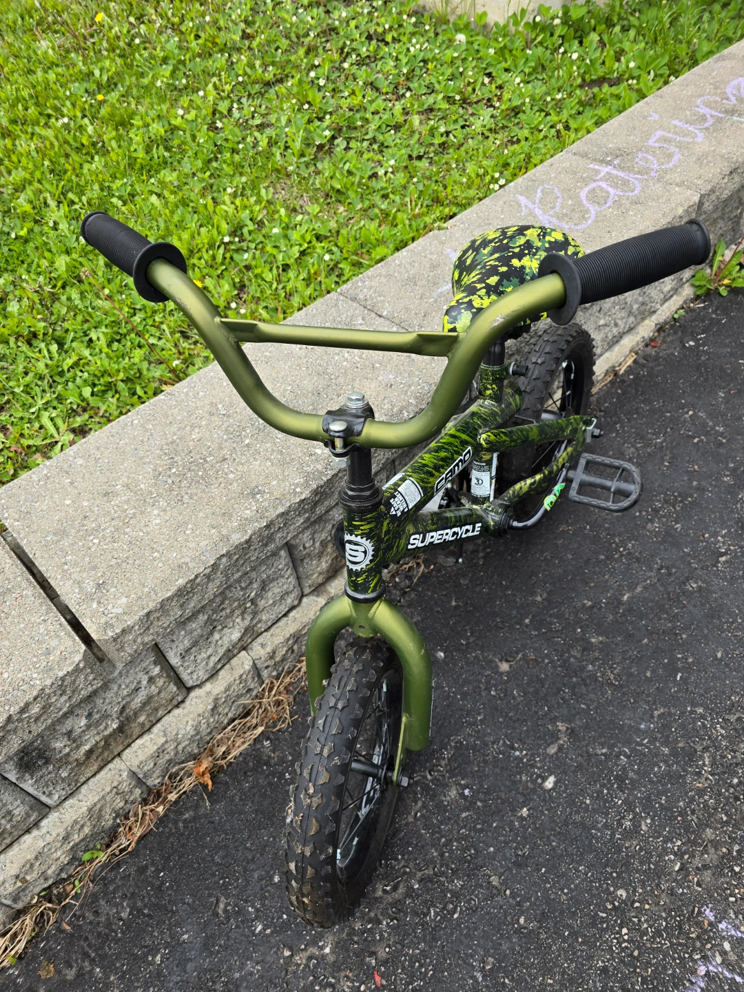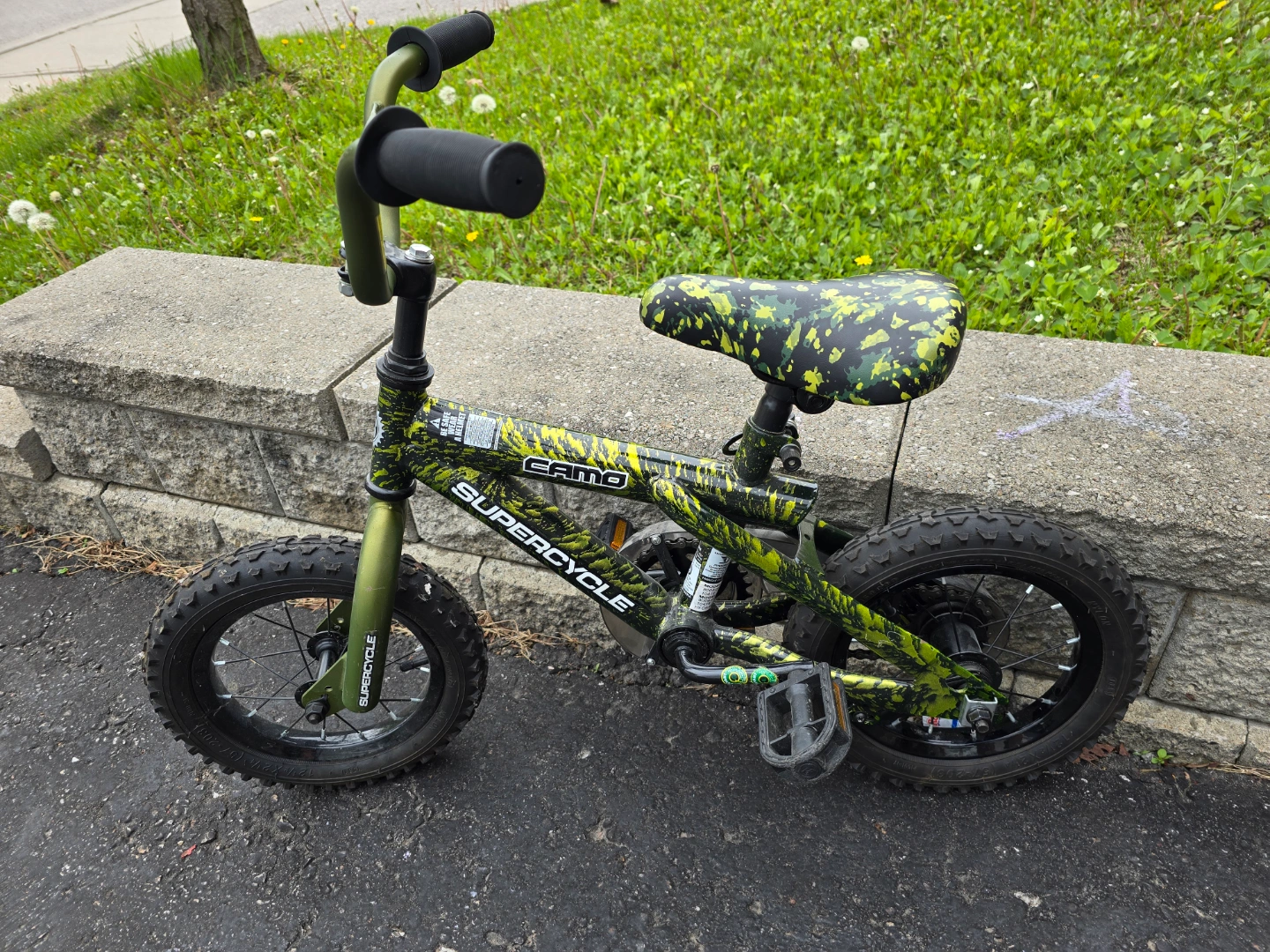 Barely used Supercycle kids' bike. 12" wheels, Small size, camo design. Great condition. Ready for a new rider.