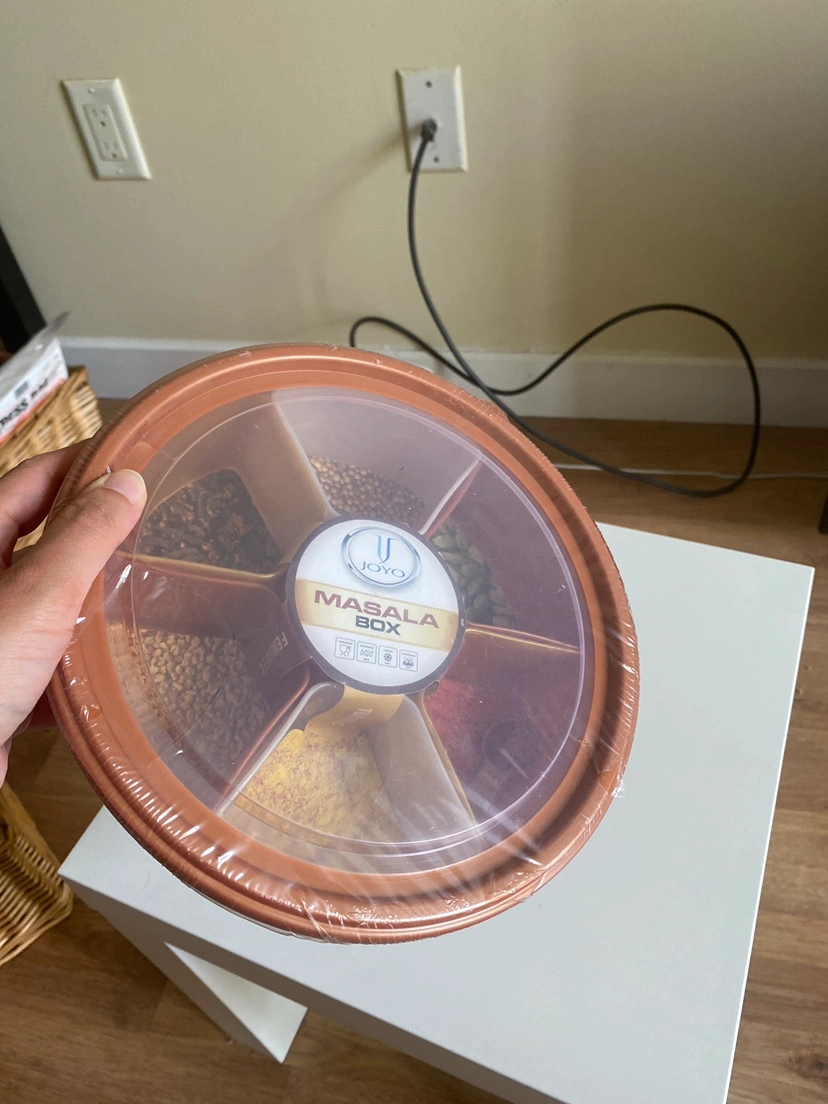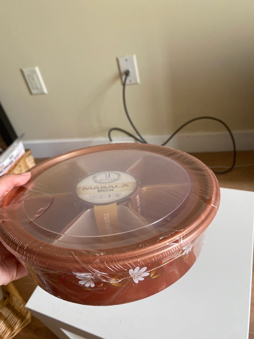 Round spice container. Six compartments. Clear lid. Brown colour. Floral design. Brand new, still in plastic.