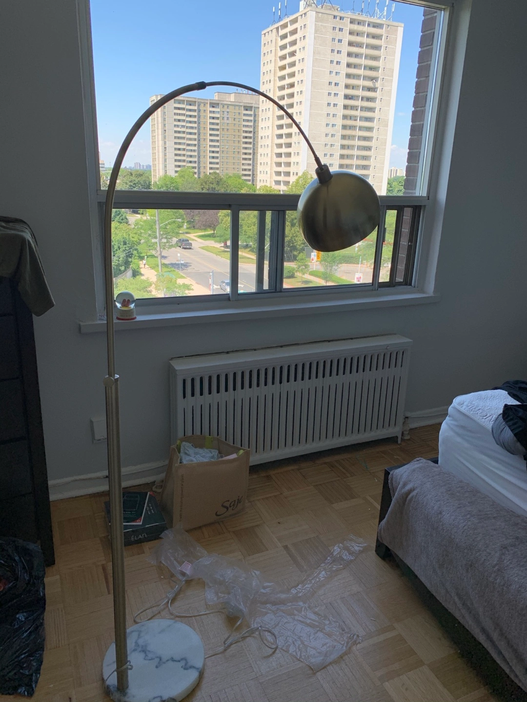 Elegant arc floor lamp. Features a marble base and gold shade. Great for living room or bedroom.