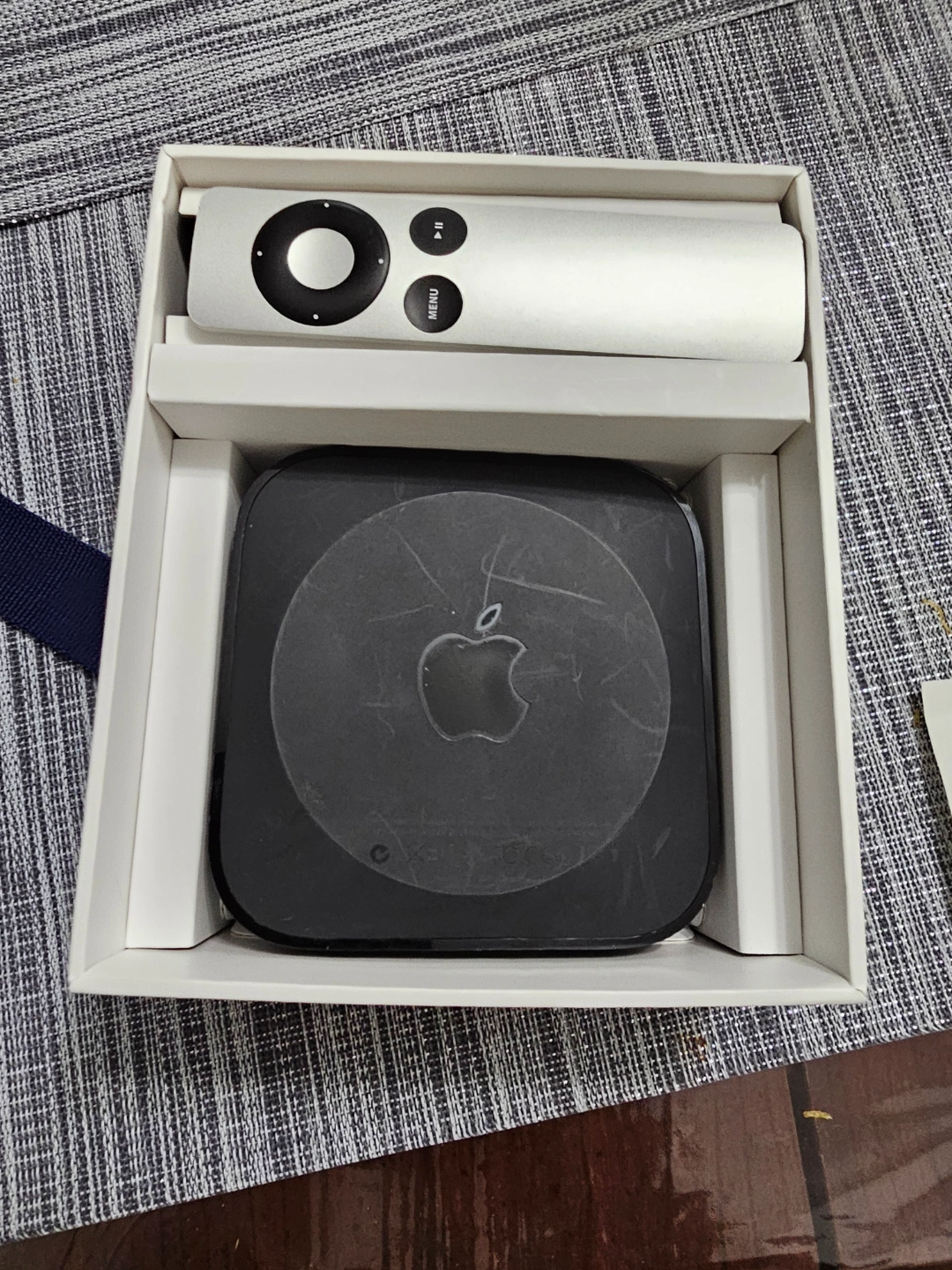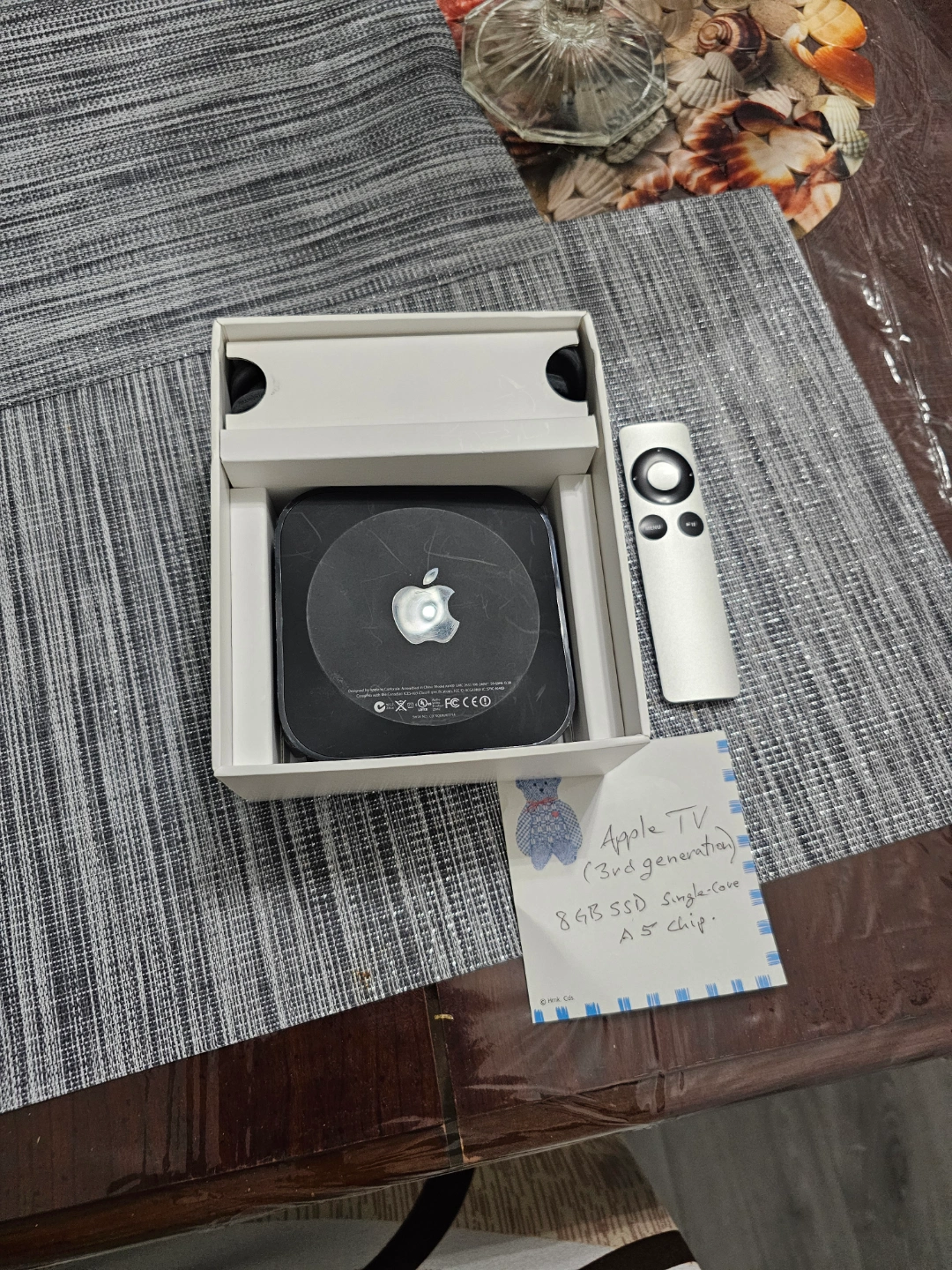 Apple TV 3rd generation. 8GB SSD. Single-core A5 chip. Includes remote and power cable. Pre-owned, some cosmetic wear.