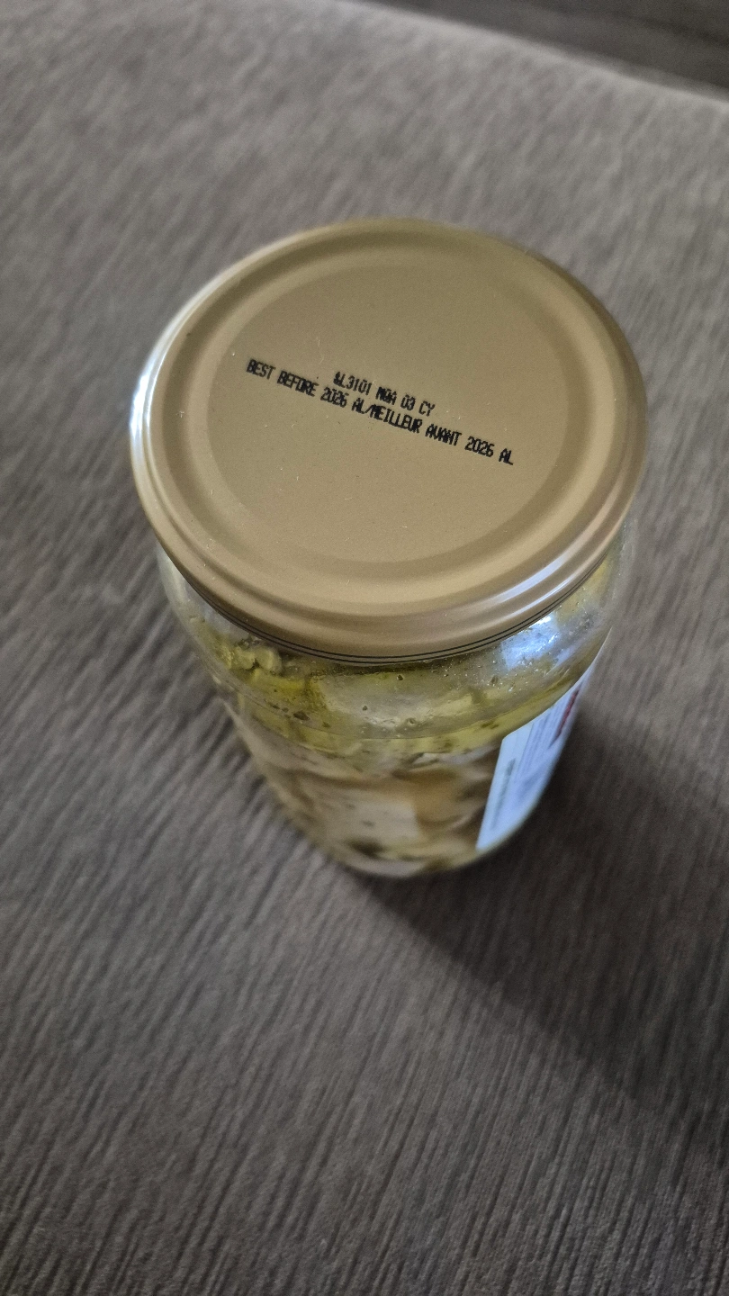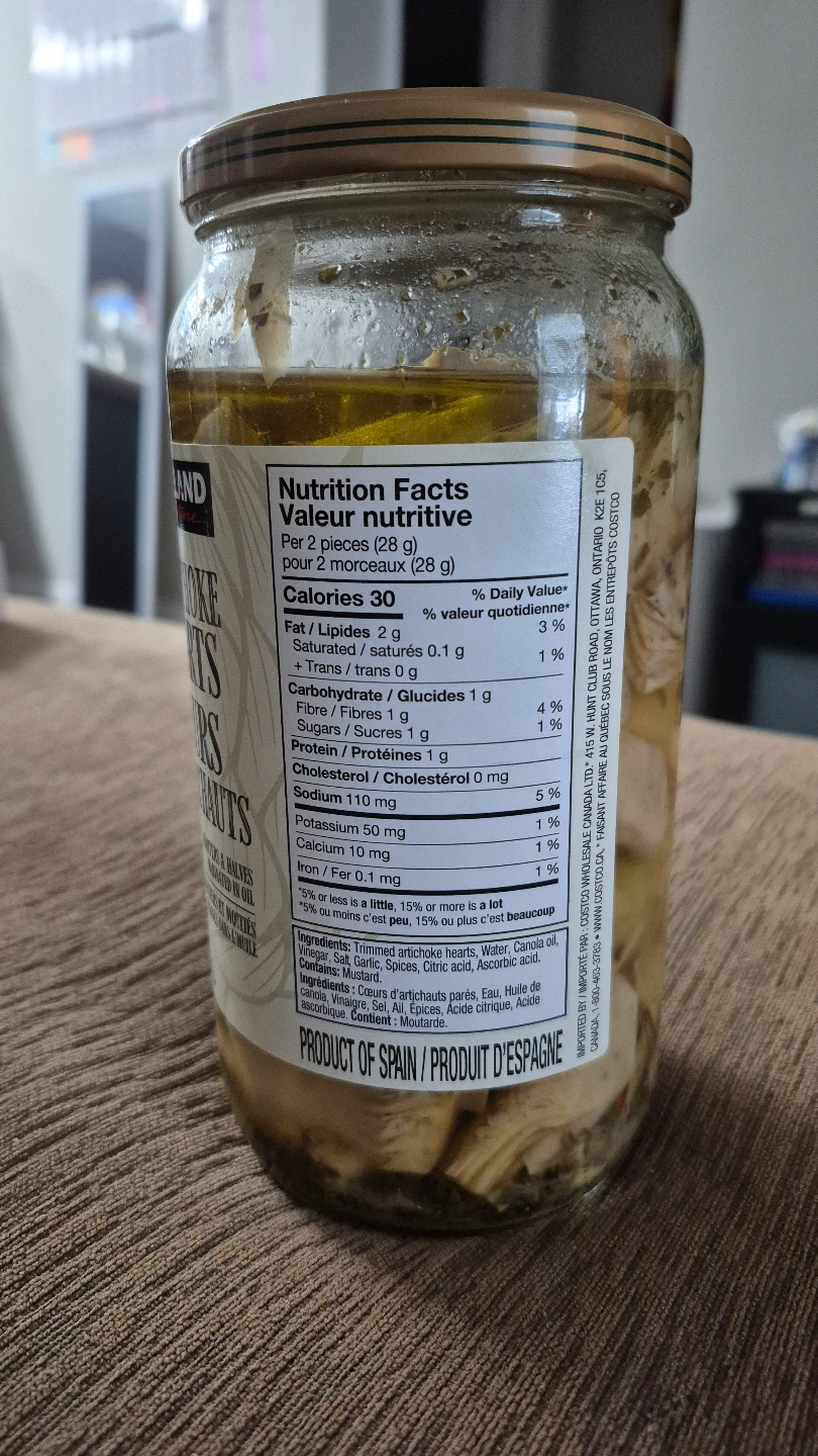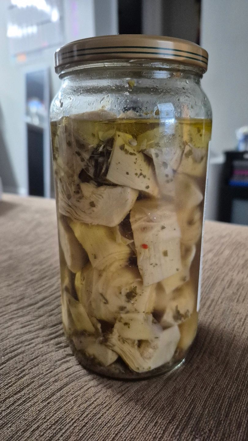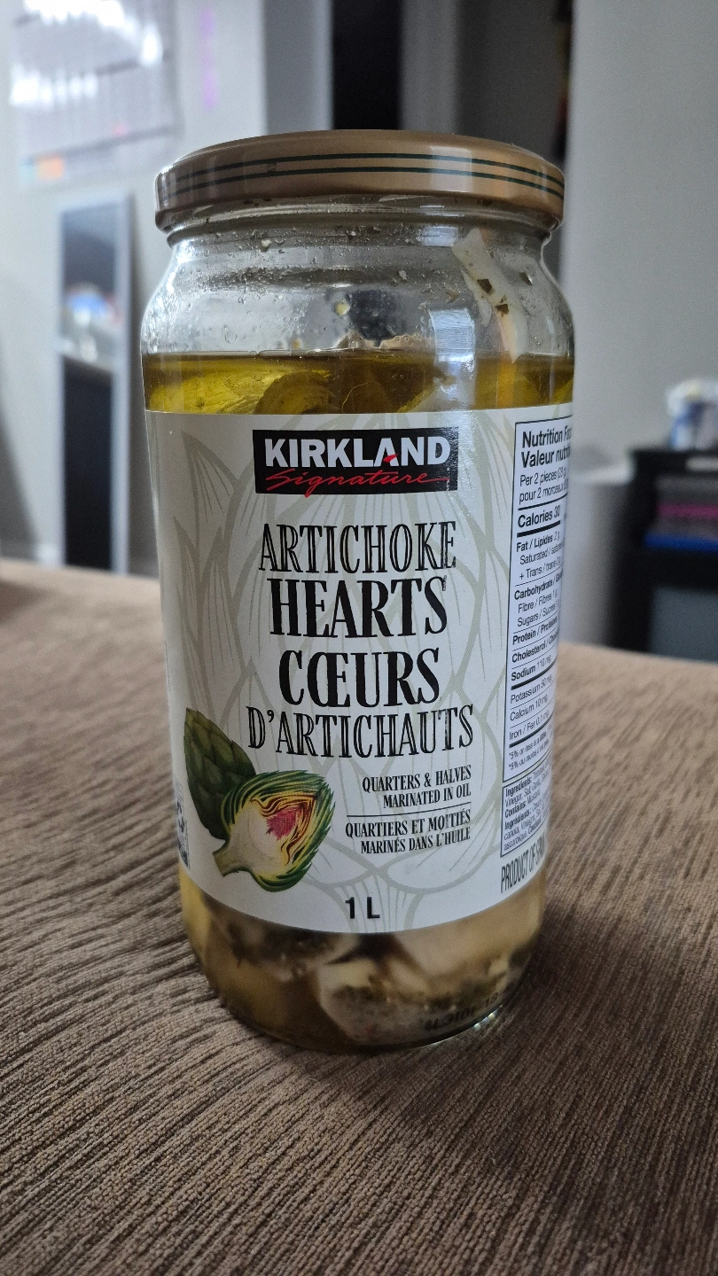 Jar of Kirkland Signature marinated artichoke hearts. Product of Spain. Contains approximately 1 litre. Hubby took out some and will not eat the rest π€·π»ββοΈ Not expired.