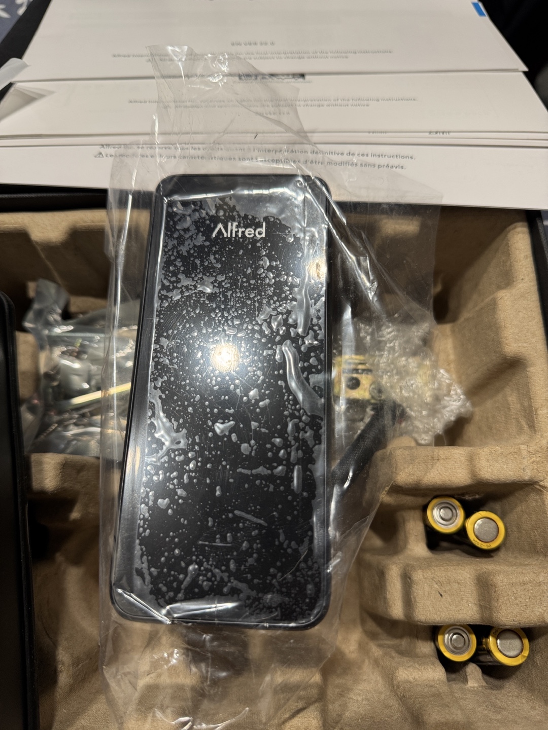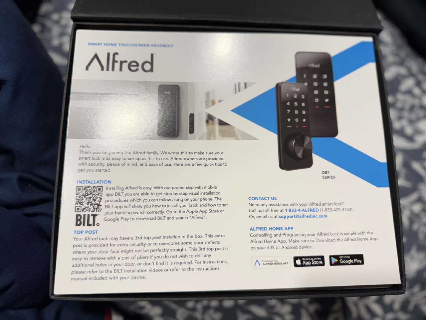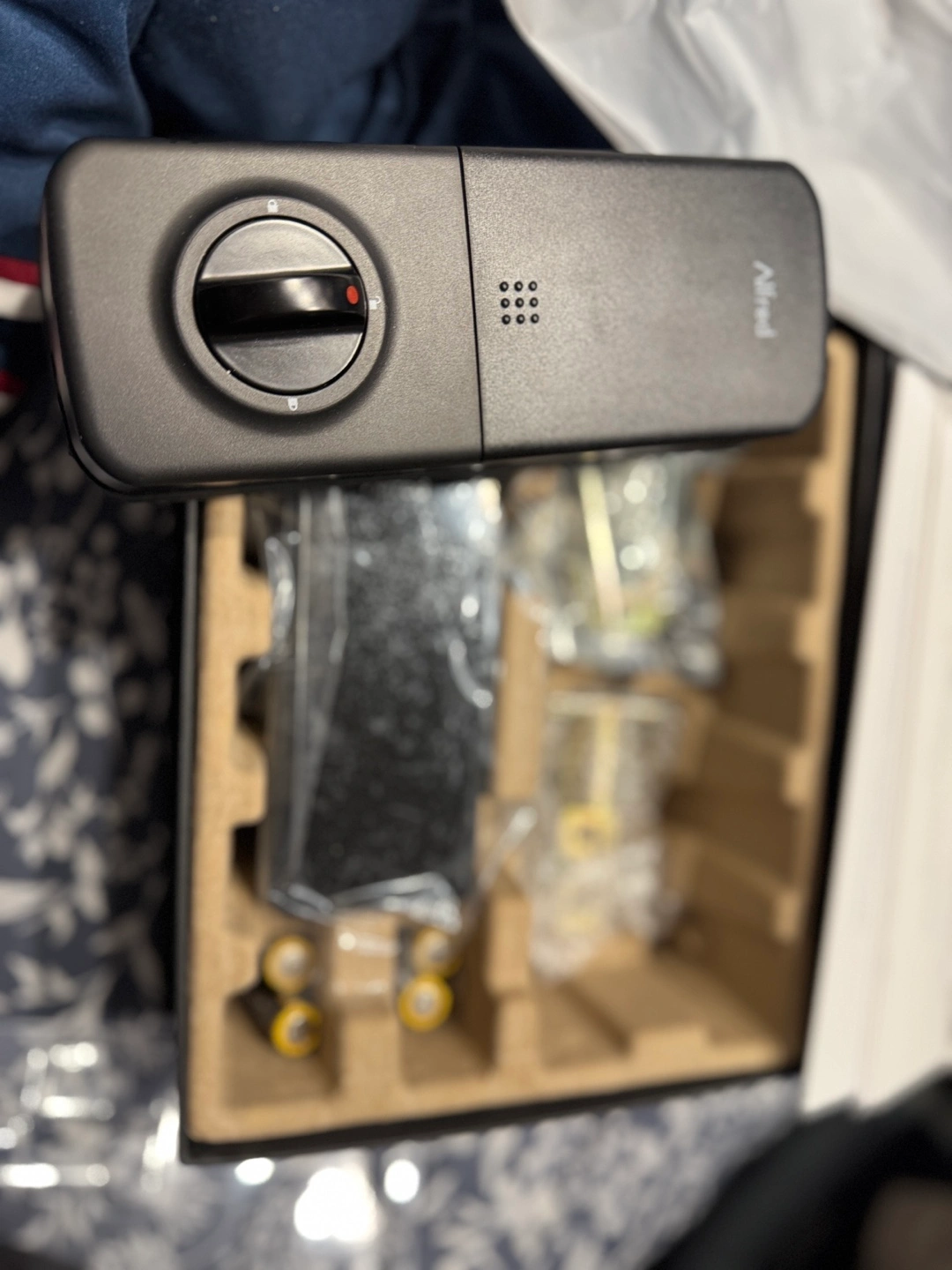 Alfred smart home touchscreen deadbolt. Brand New. Includes all components and instructions. Bluetooth enabled. Easy setup with mobile app.