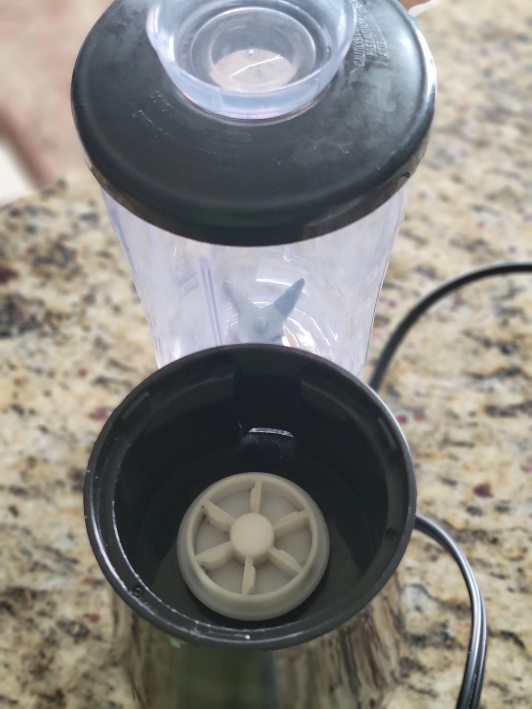 Small personal blender. Black plastic housing. Clear plastic cup. Pulse function.