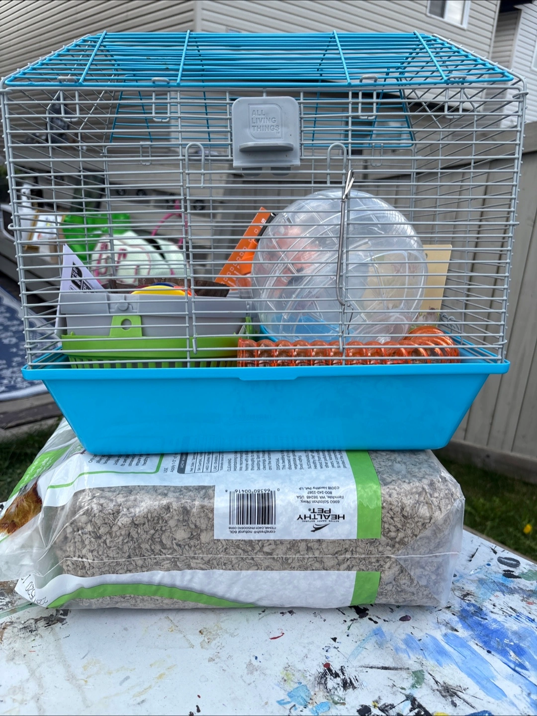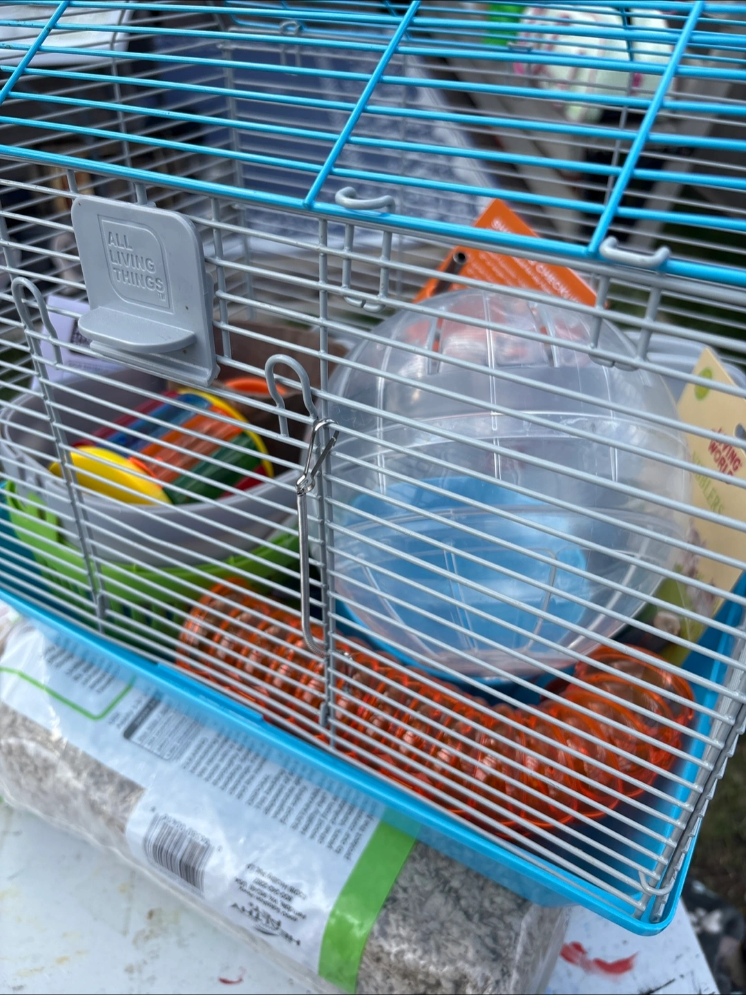 Complete small animal starter kit. Includes cage, exercise ball, tunnels, treats, food dish, water bottles, bedding, etc. Great for hamsters or other small rodents.