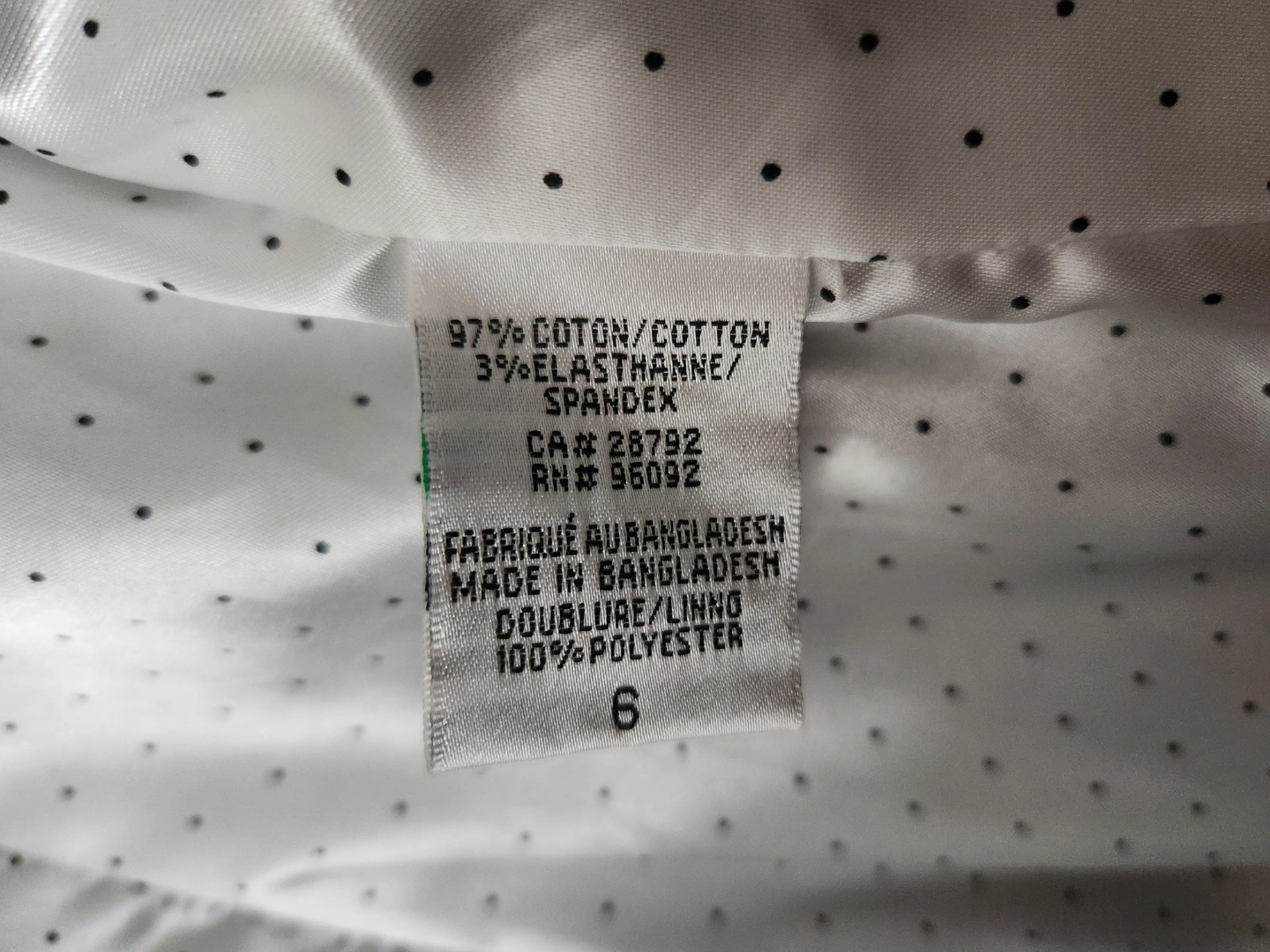 Black blazer, size 6. Two-button closure. Features a white polka dot lining. 97% cotton, 3% spandex outer shell. 100% polyester lining. Made in Bangladesh.