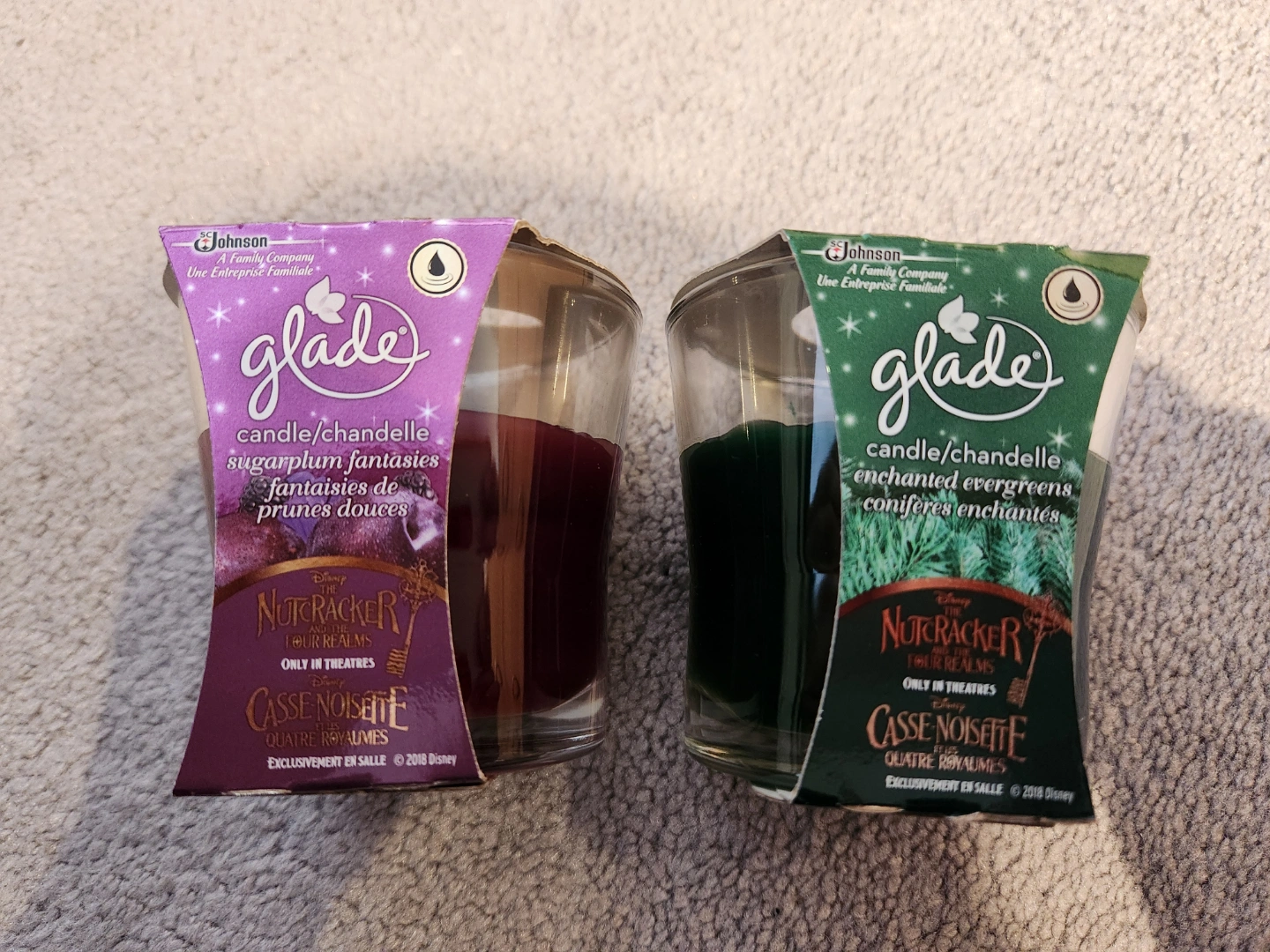 Pair of Glade jar candles. Sugarplum fantasies and enchanted evergreens scents. The Nutcracker and the Four Realms themed.
