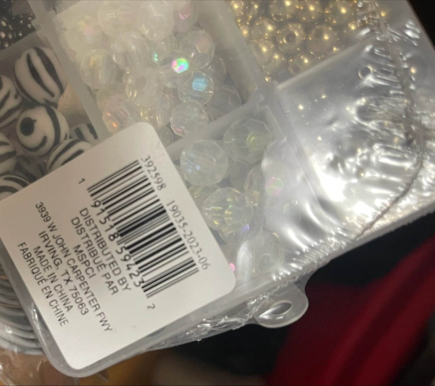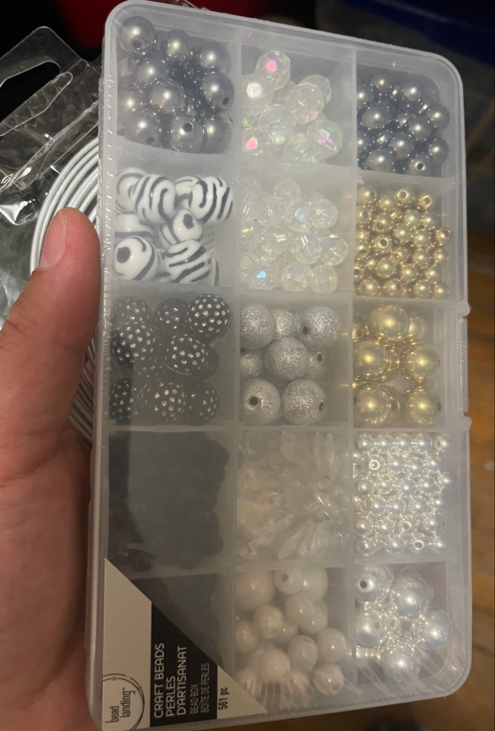 Assorted craft beads in a clear plastic container. Includes various colours and styles. Great for jewellery making. Pick up Dundas and Spadina.