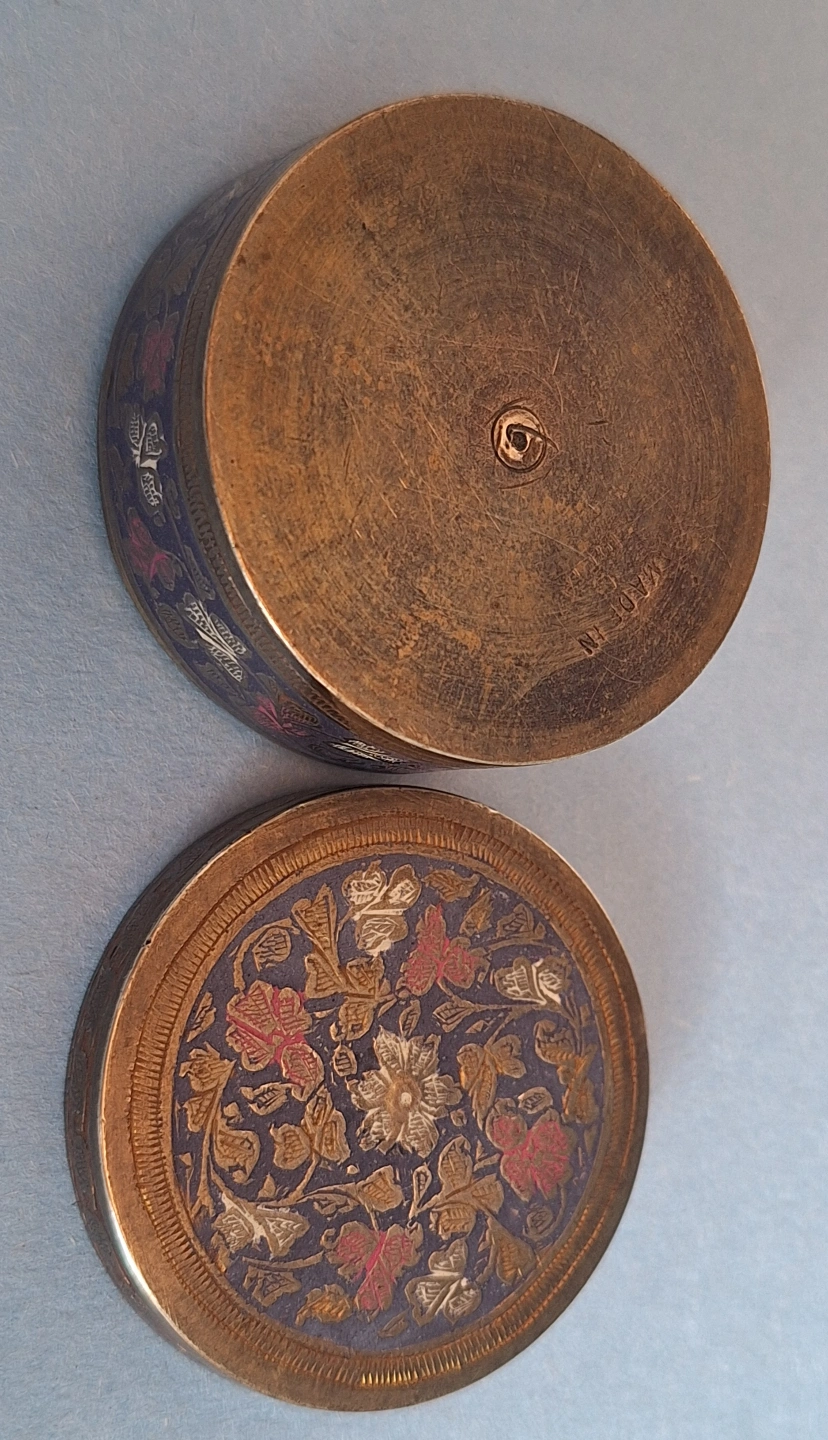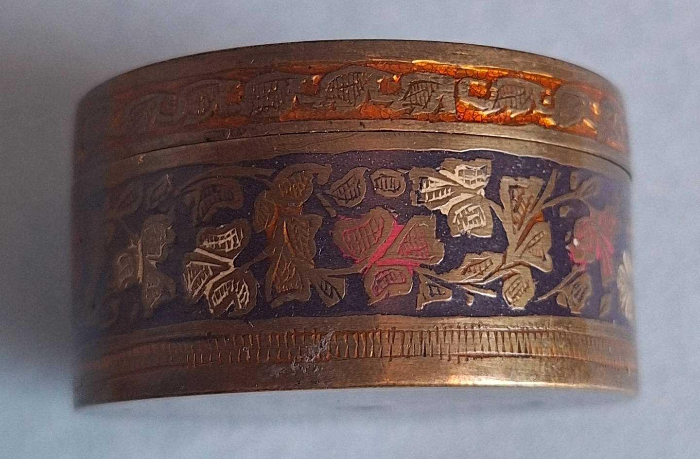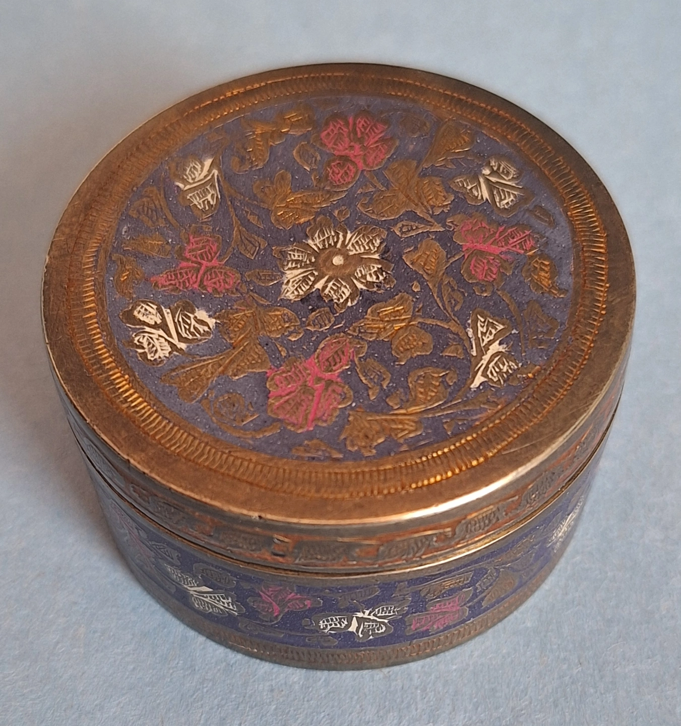 Small round trinket box. Brass construction with enamel work. Intricate floral pattern on the lid and sides. Dark blue enamel background. Gold and coloured accents. Perfect for jewellery, pills or other small items.