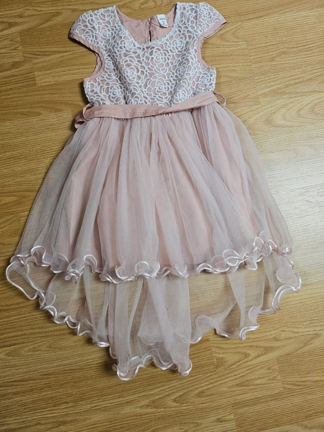 Adorable pink tulle dress. Features white lace bodice and satin waistband. High-low hemline with scalloped edges. Size 5Y.