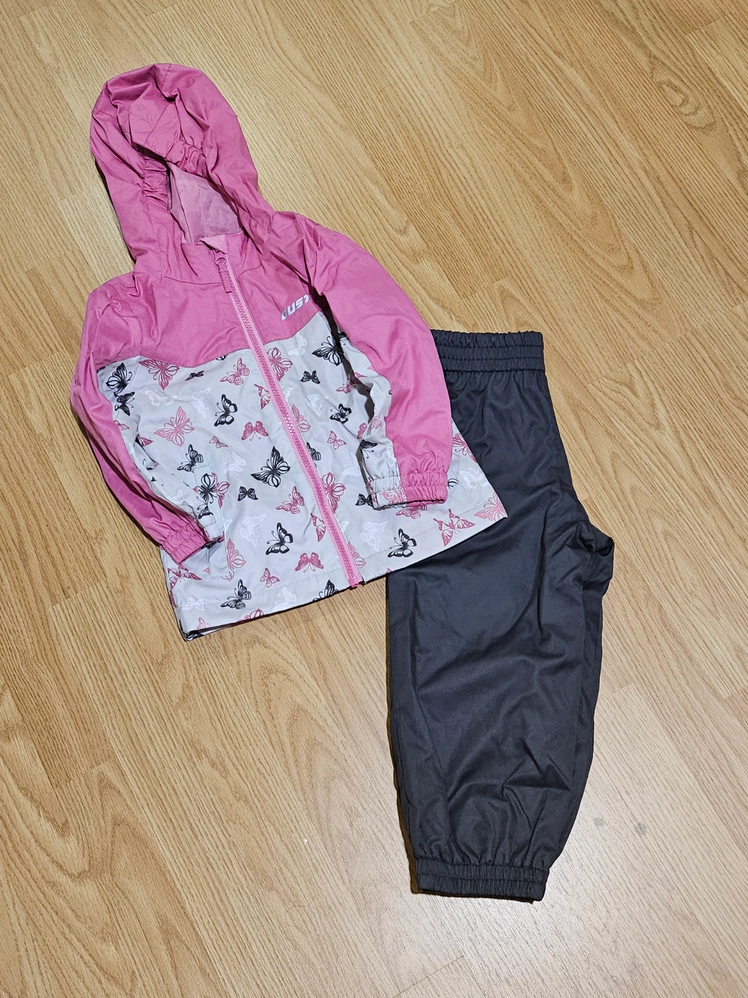 Adorable rain suit, pink jacket with butterfly print, matching black pants. Zipper closure. Great for rainy days. Size 3T