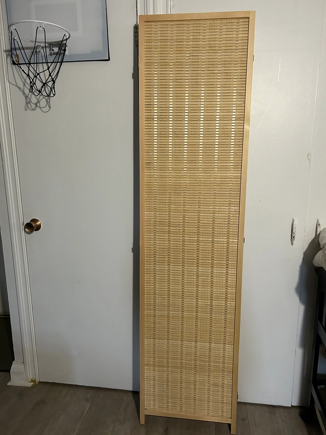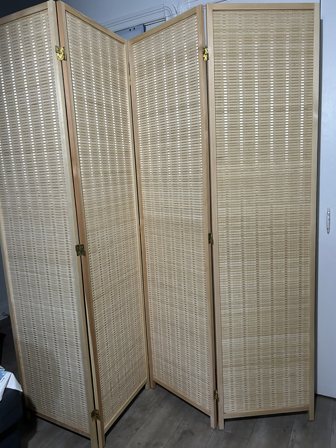 Four panel room divider. Light wood frame. Woven cane or bamboo design. Good condition. Folds easily for storage.