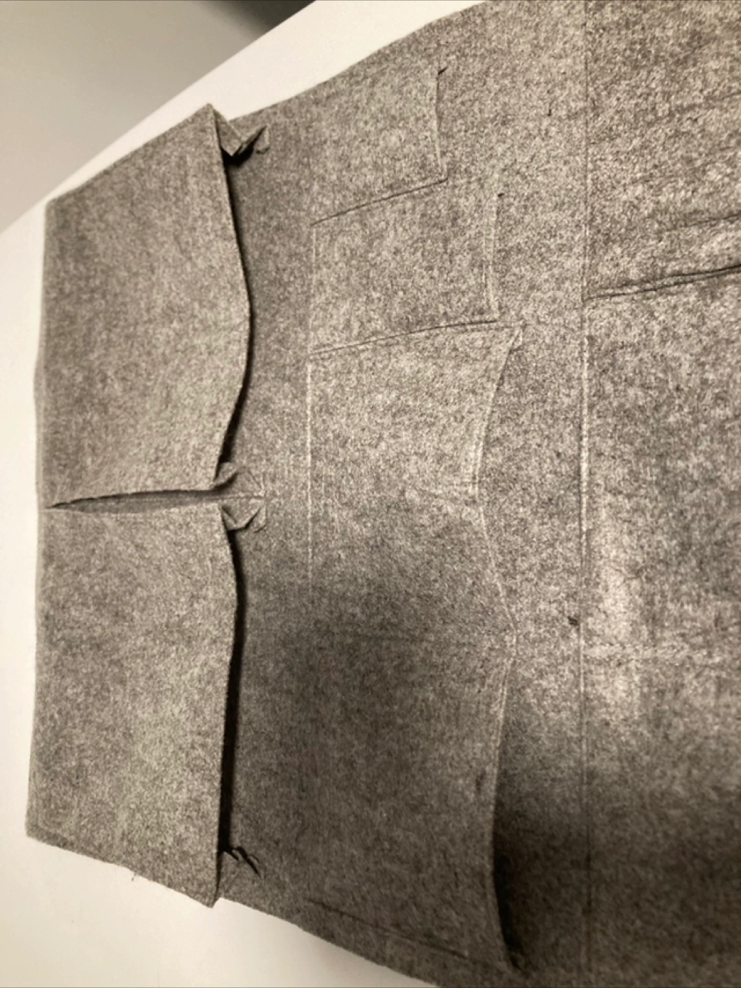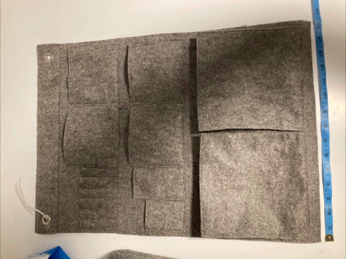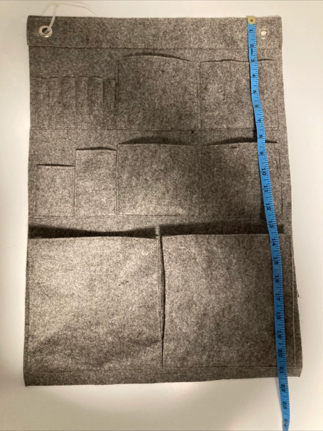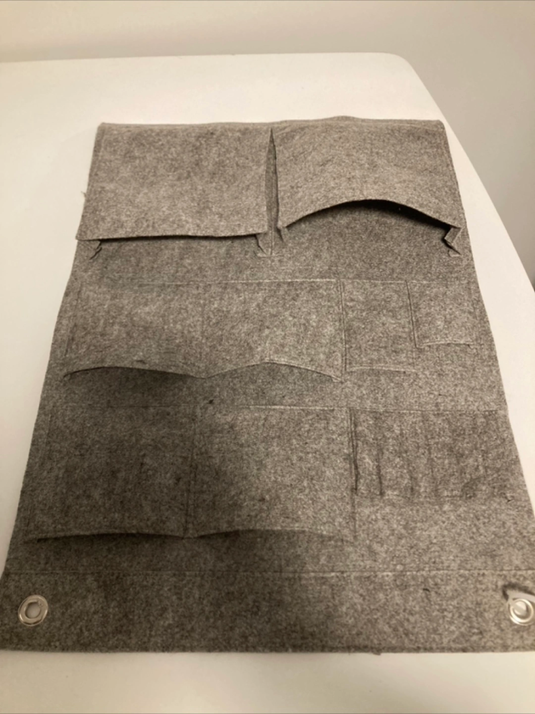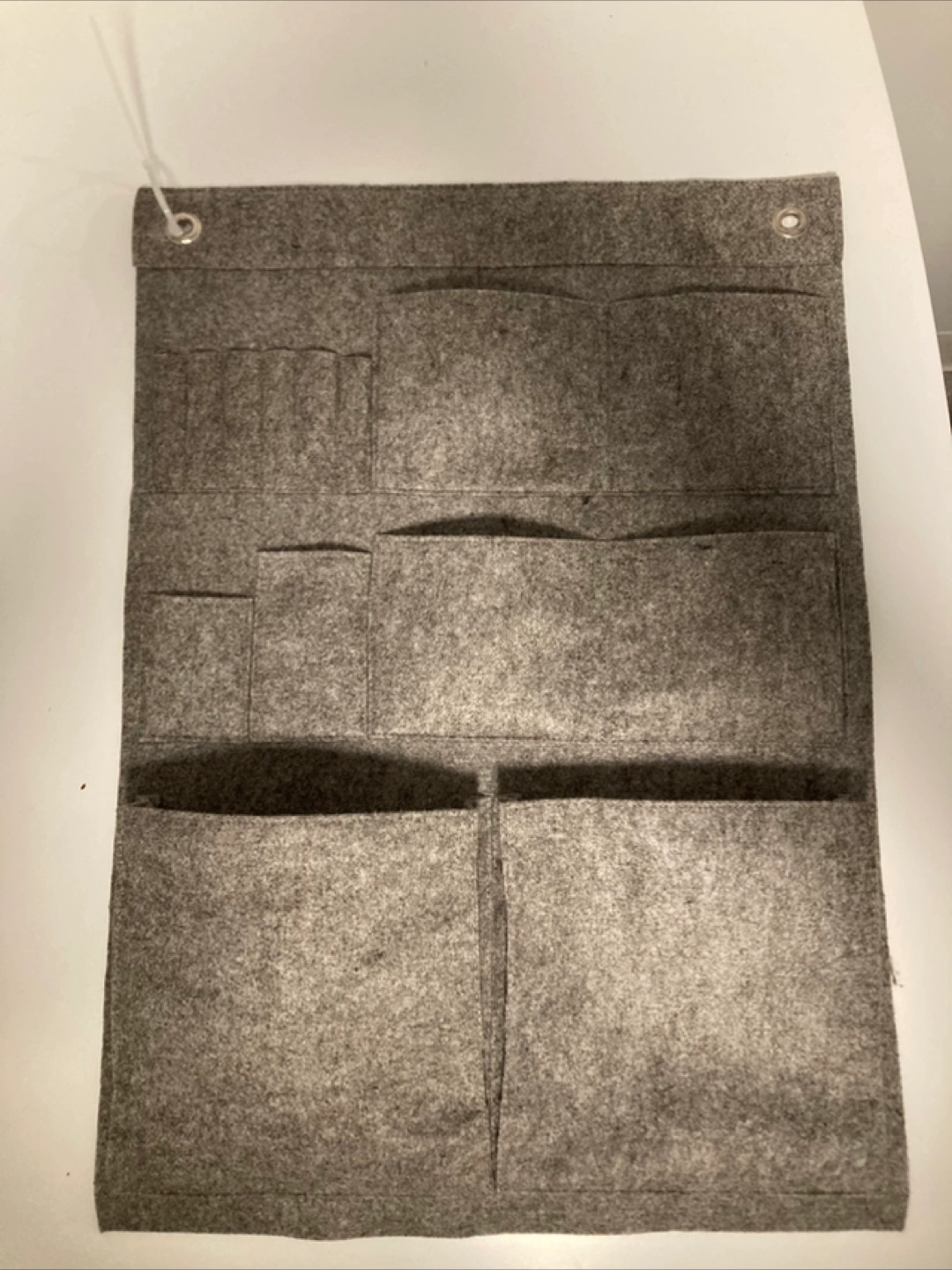 Grey felt wall organizer. Multiple pockets of varying sizes. Great for organizing small items. Hangable design with grommets.