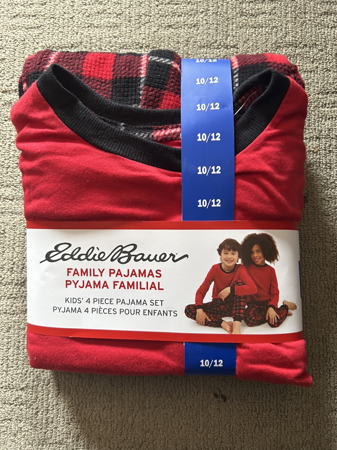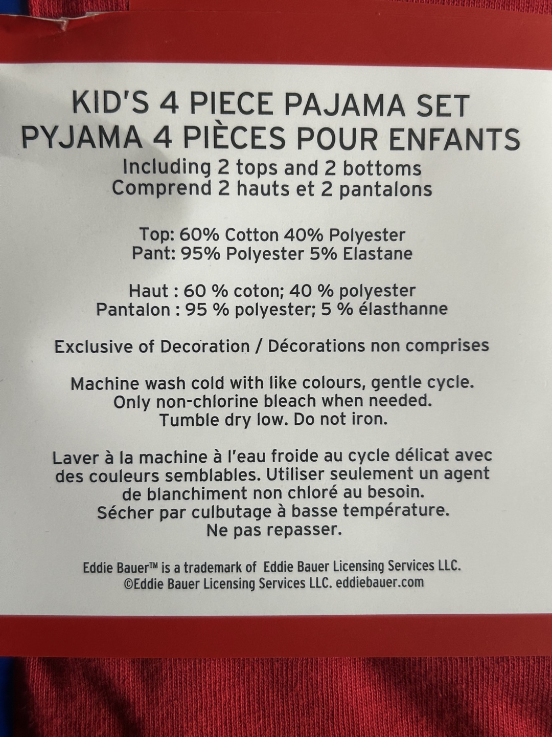 Brand new set of Eddie Bauer kids' 4-piece pajamas, perfect for cozy nights and holiday cheer! This set includes 2x long-sleeved red tops and 2x plaid bottoms, ensuring your little one stays comfortable and stylish. The set is new, complete with tags, ready to be enjoyed.