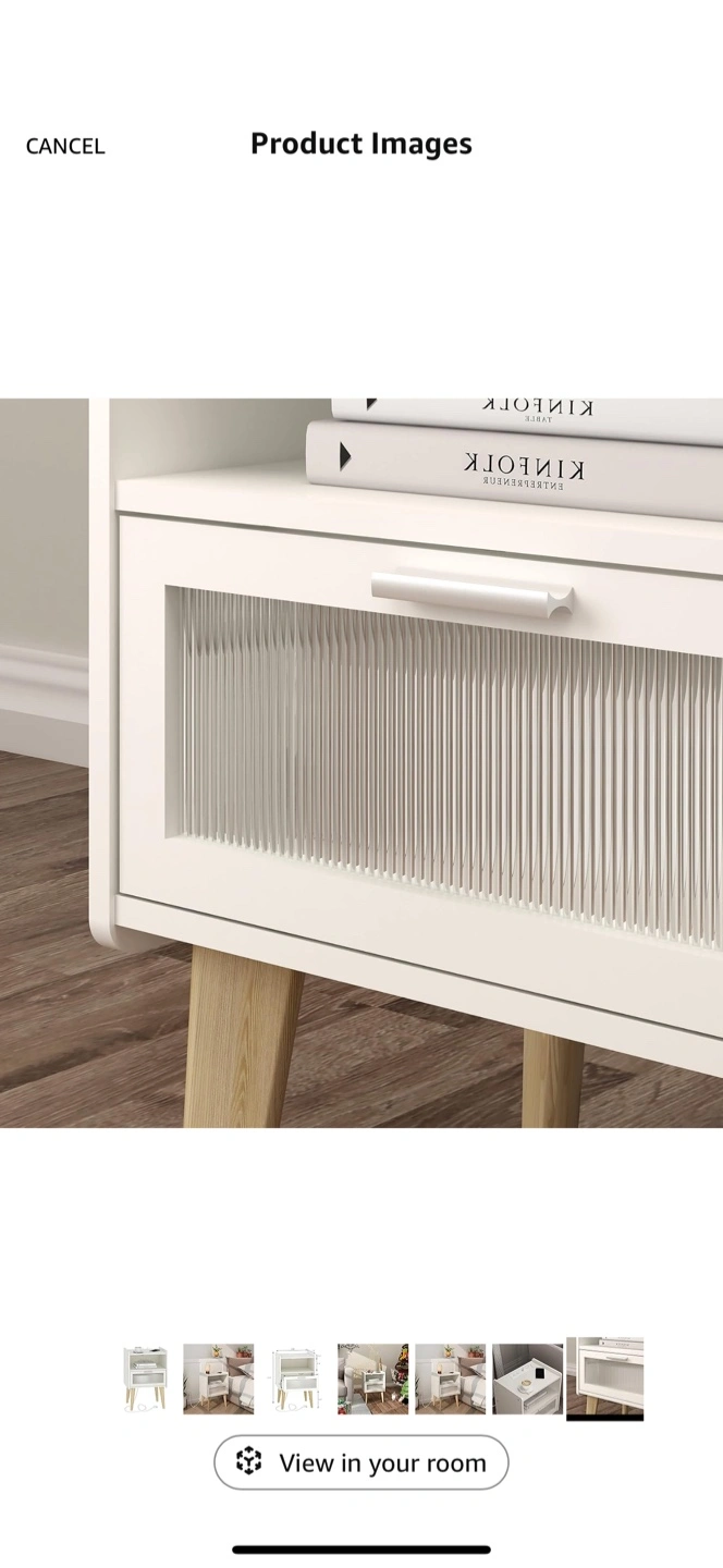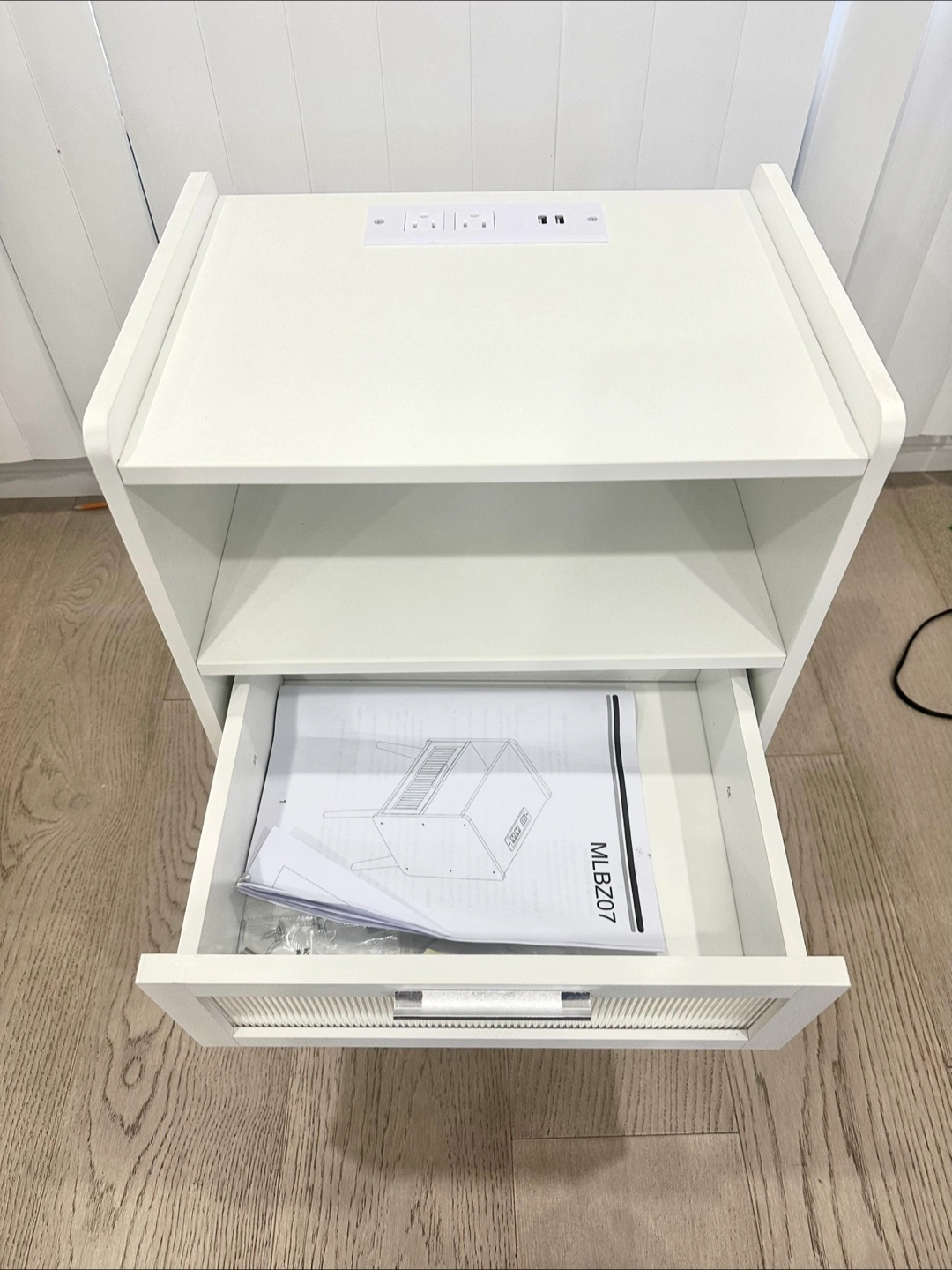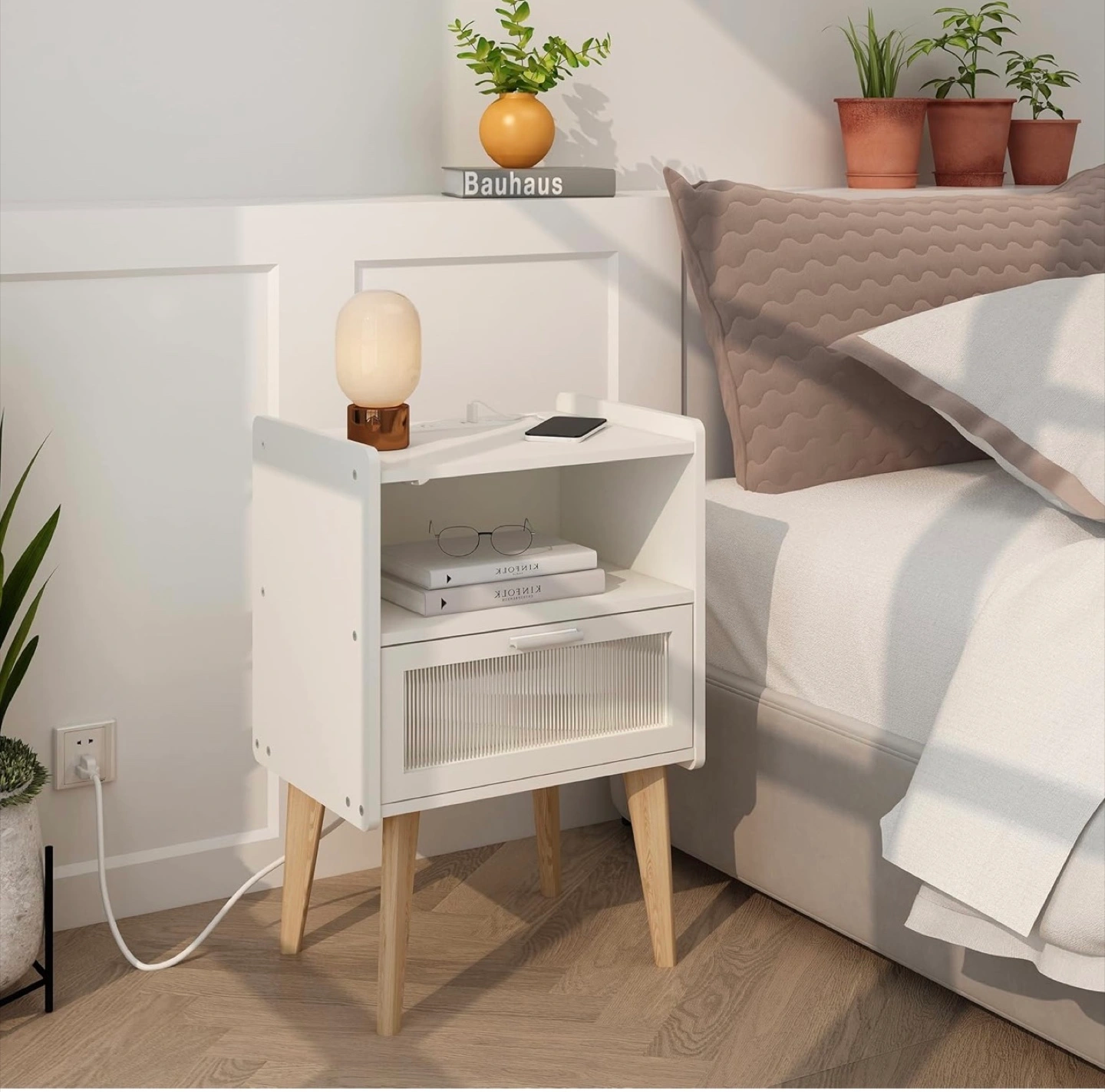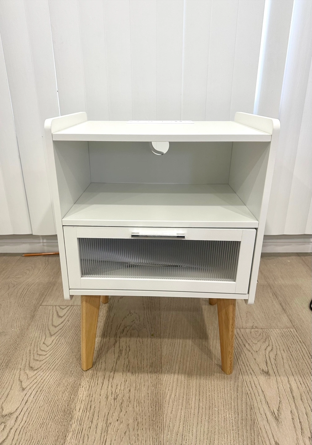 Modern nightstand. Features built-in power outlets and USB ports. One drawer with fluted front. wood legs. Compact design, perfect for small spaces. Assembled.