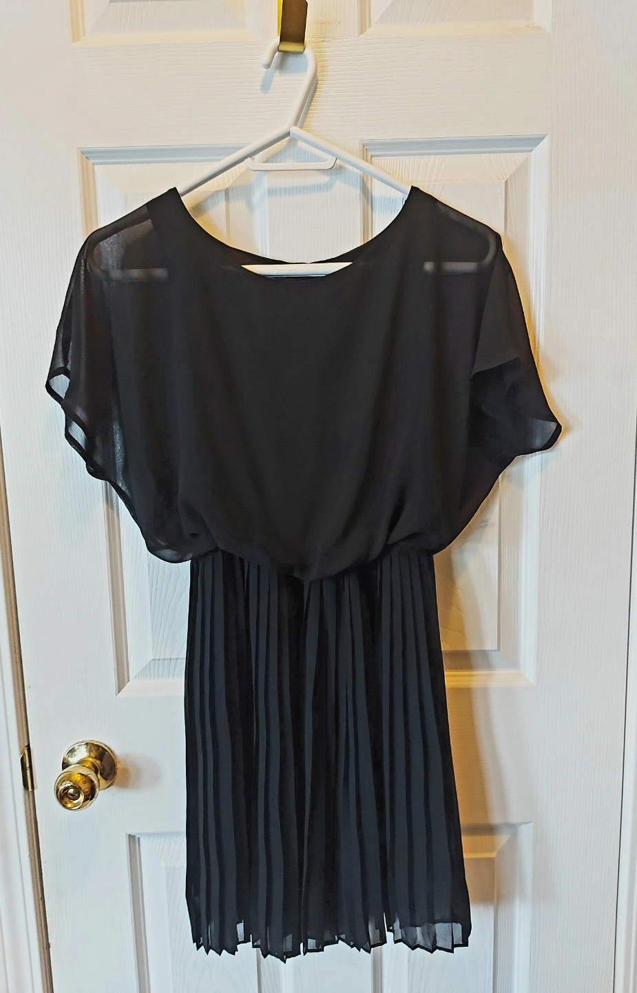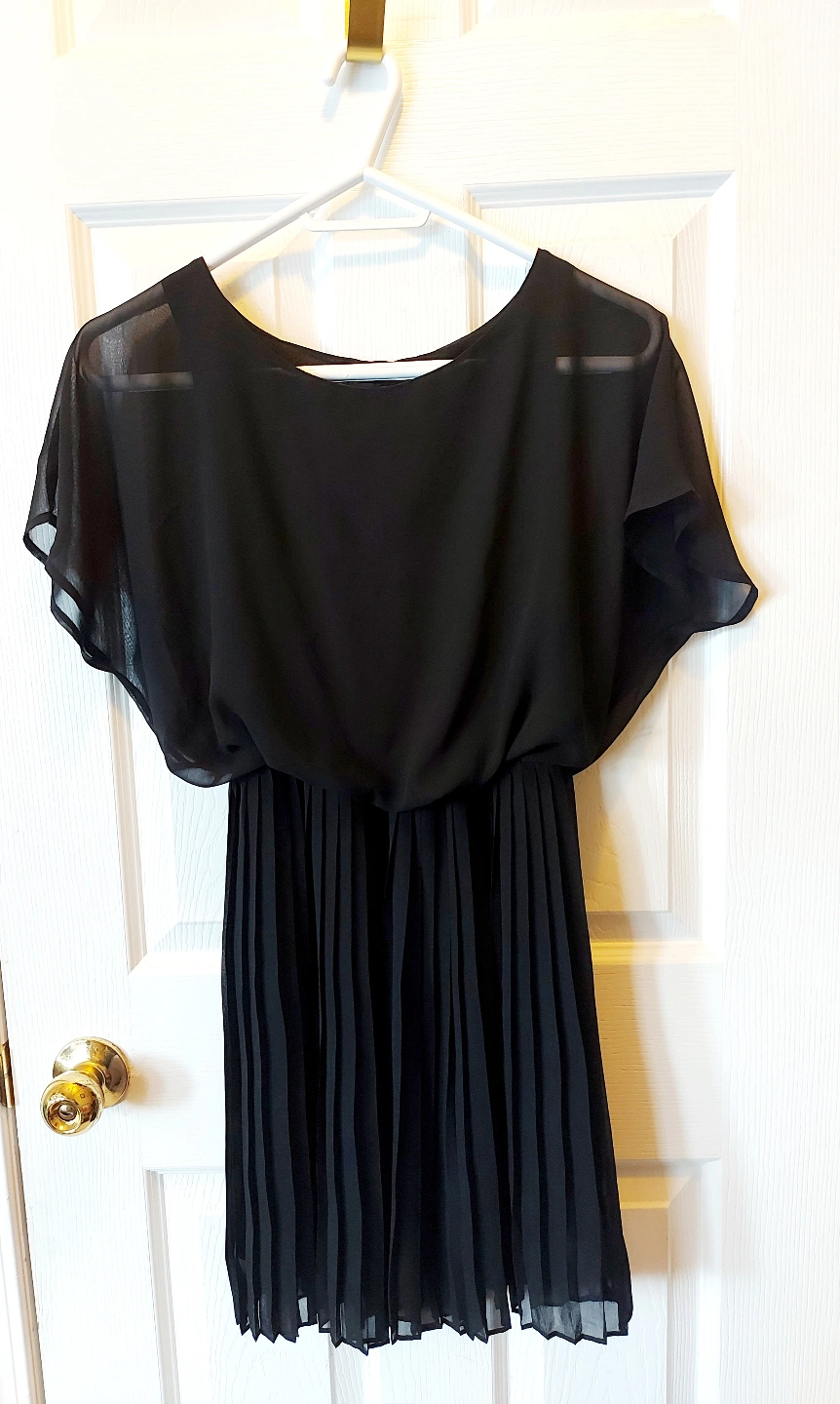 Black Dress This black dress features a flowing, semi-sheer top with short, fluttery sleeves and a cinched waist, transitioning into a pleated skirt. No return please Forever 21 Size: Large