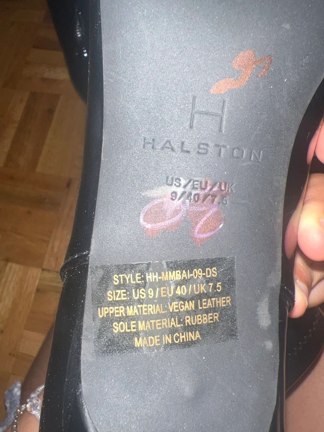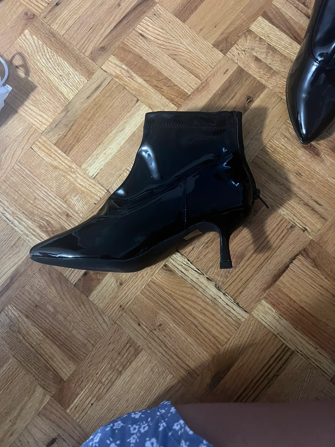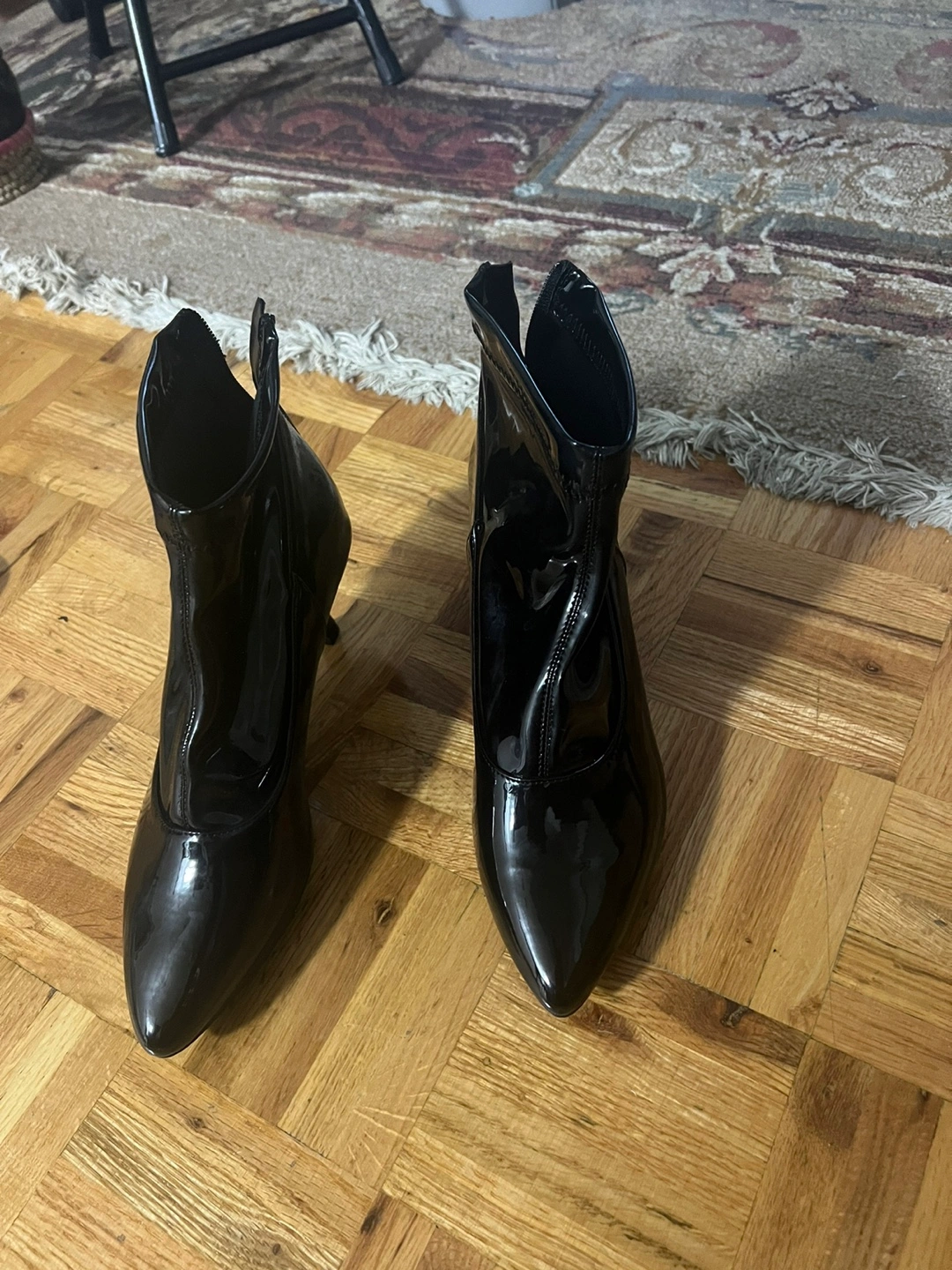 Black patent leather ankle boots. Vegan leather upper. Rubber sole. Size US 9/EU 40/UK 7.5. Made in China. Back zipper closure. Pointed toe. Kitten heel.